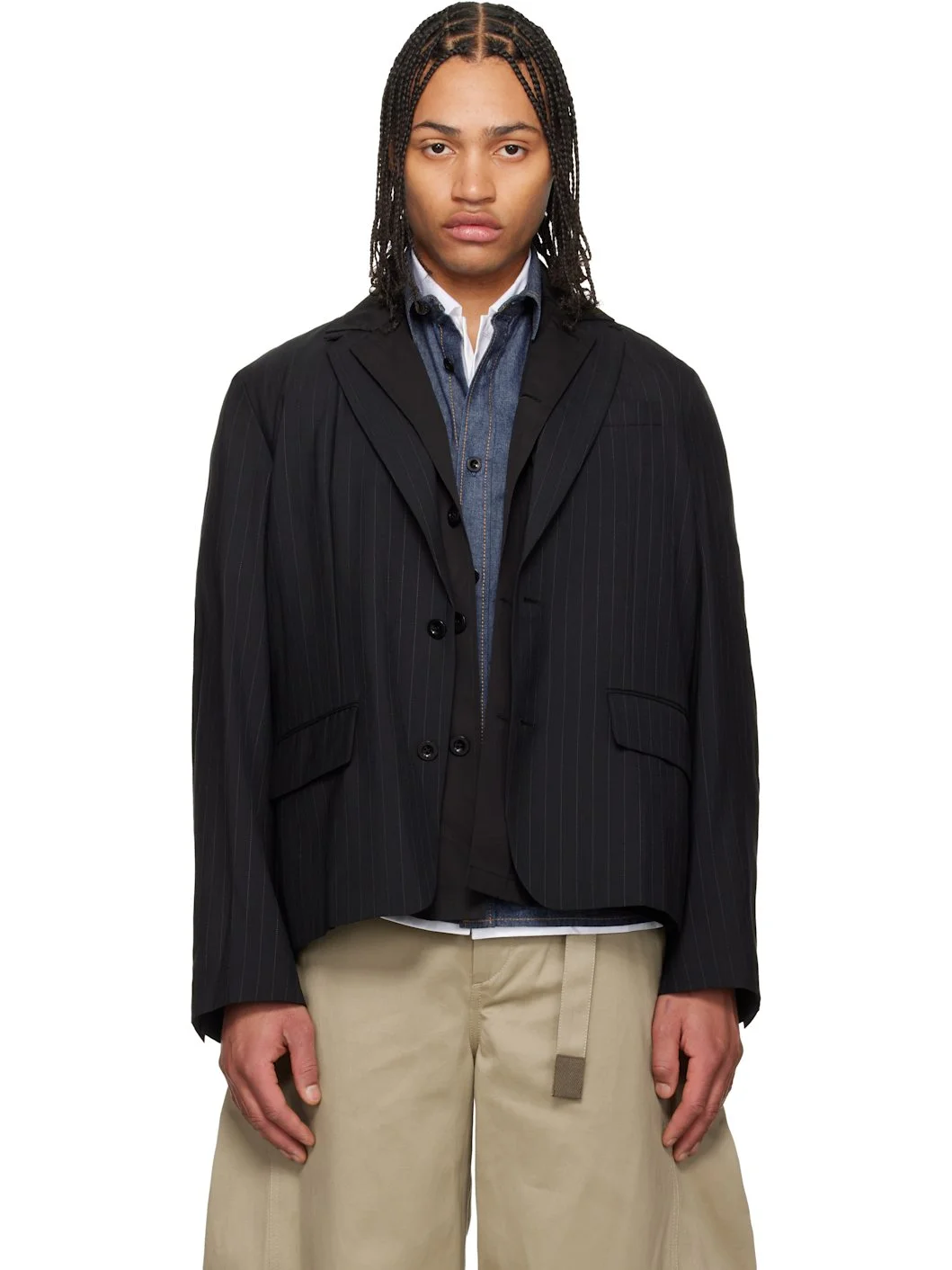 Plain-woven wool-blend blazer. · Pinstripes throughout · Layered notched lapel · Button closure · Welt pocket at chest · Flap pockets at front · Surgeon's cuffs · Vents at back hem Supplier color: Black Body: 70% polyester, 30% wool. Trim: 100% cotton. Made in Japan 261445M195000