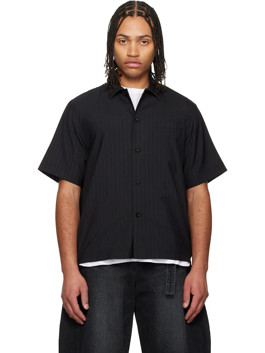 Plain-woven wool-blend shirt. · Pinstripes throughout · Spread collar · Button closure · Welt pocket at chest · Gusset at side seams · Pleats at back yoke Supplier color: Black Body: 70% polyester, 30% wool. Trim: 100% cupro. Made in Japan 261445M192011