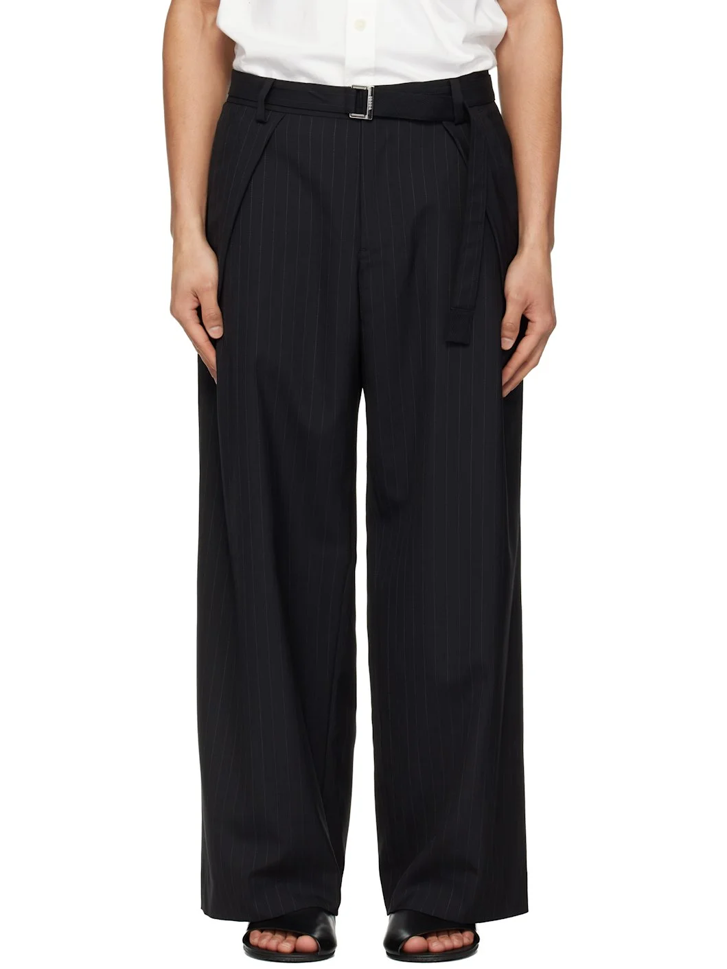 Plain-woven wool-blend trousers. · Stripes throughout · Belt loops and detachable cinch belt at waistband · Four-pocket styling · Zip fly · Pleats at front · Creased legs · Knee-length satin lining Supplier color: Black Body: 70% polyester, 30% wool. Lining: 100% cupro. Made in Japan 261445M191006