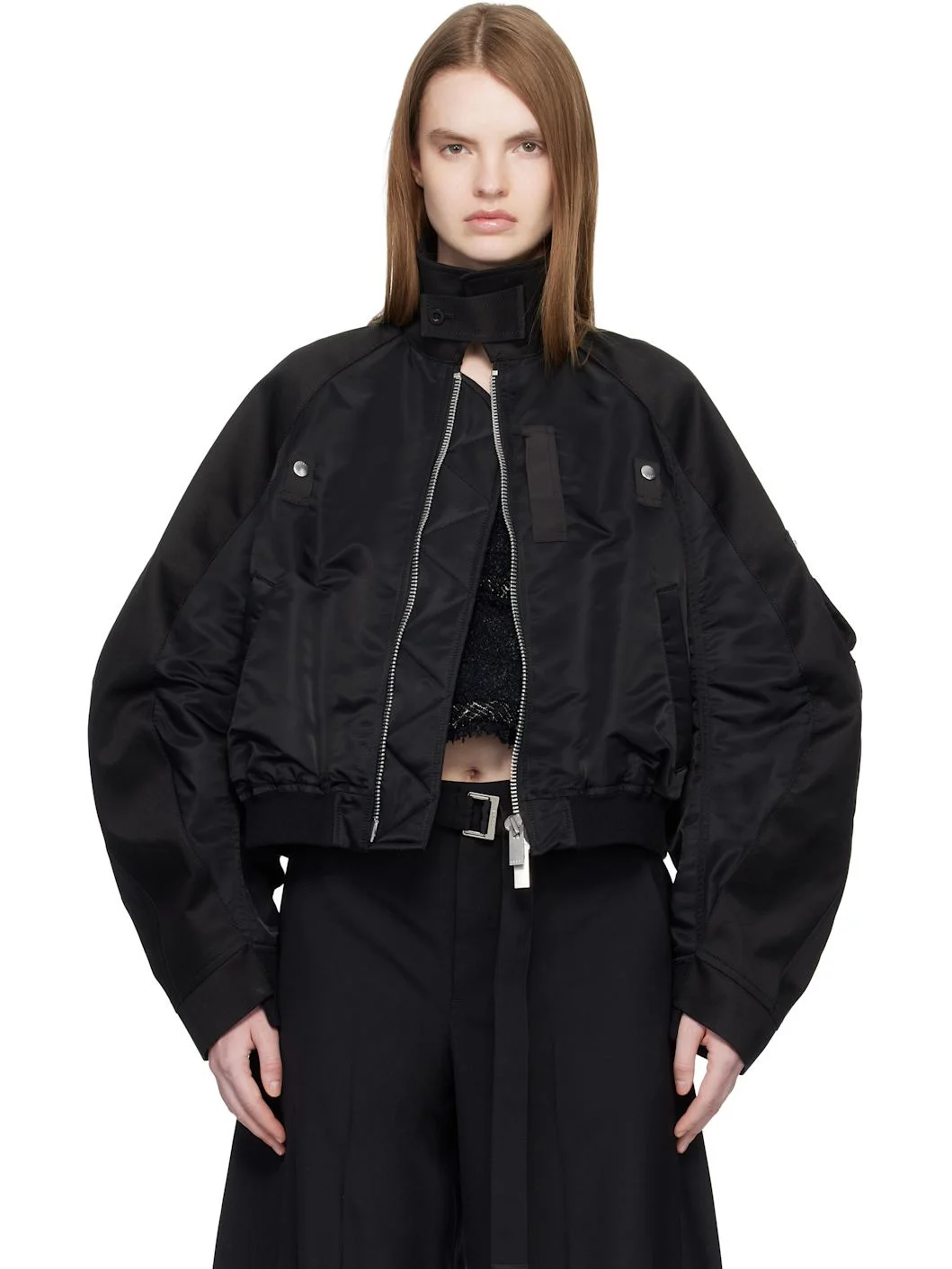 Nylon satin and cotton twill bomber jacket. · Paneled construction · Button tab at spread collar · Two-way zip closure · Press-stud tabs and grosgrain trim at chest · Welt pockets at waist · Rib-knit hem and cuffs · Raglan sleeves · Utility pocket at sleeve · Fully lined Supplier color: Black Body 1: 100% nylon. Body 2: 100% cotton. Trim: 55% polyester, 44% cotton, 1% polyurethane. Fill: 100% polyester. Lining 1: 100% polyester. Lining 2: 100% cupro. Made in Japan 261445F063007