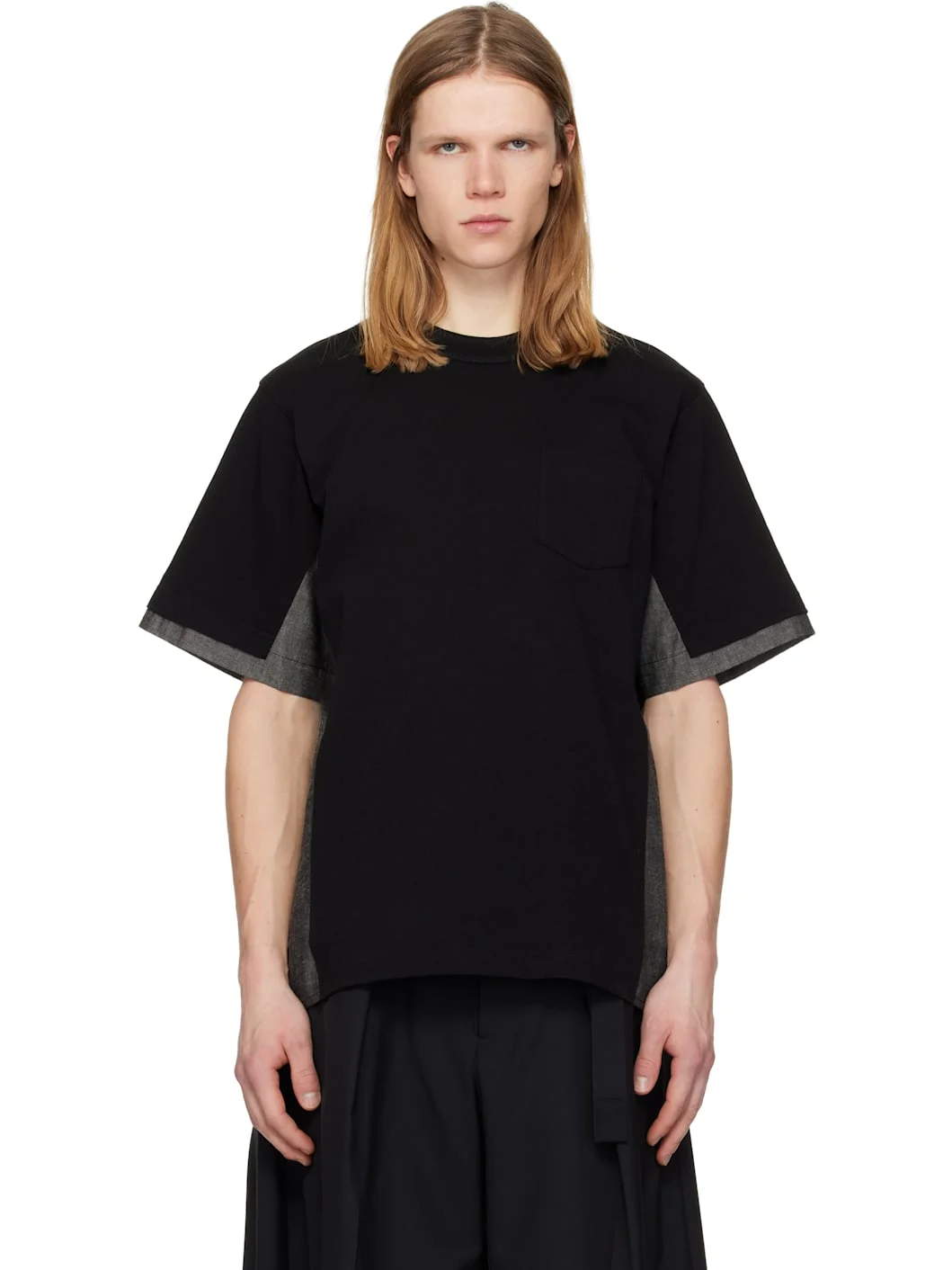 Cotton jersey and non-stretch denim T-shirt. · Paneled construction · Rib-knit crewneck · Patch pocket at chest · Seam pockets Supplier color: Black Body 1: 100% cotton. Body 2: 100% cotton. Made in Japan 261445M213032