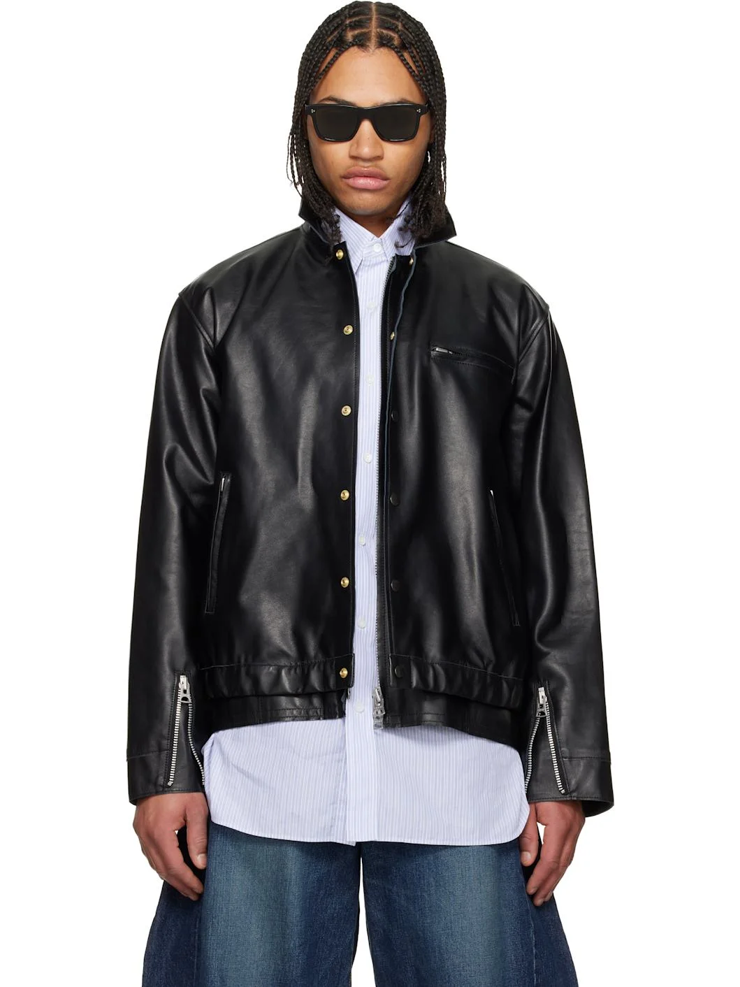 Grained leather jacket. · Spread collar · Two-way zip closure with press-stud placket · Zip pockets at front · Partially elasticized layered hem · Zip expansion panel at press-stud barrel cuffs · Pin-buckle straps at back hem · Full twill lining Supplier color: Black Body: 100% leather. Lining: 100% cupro. Made in Japan 261445M181003
