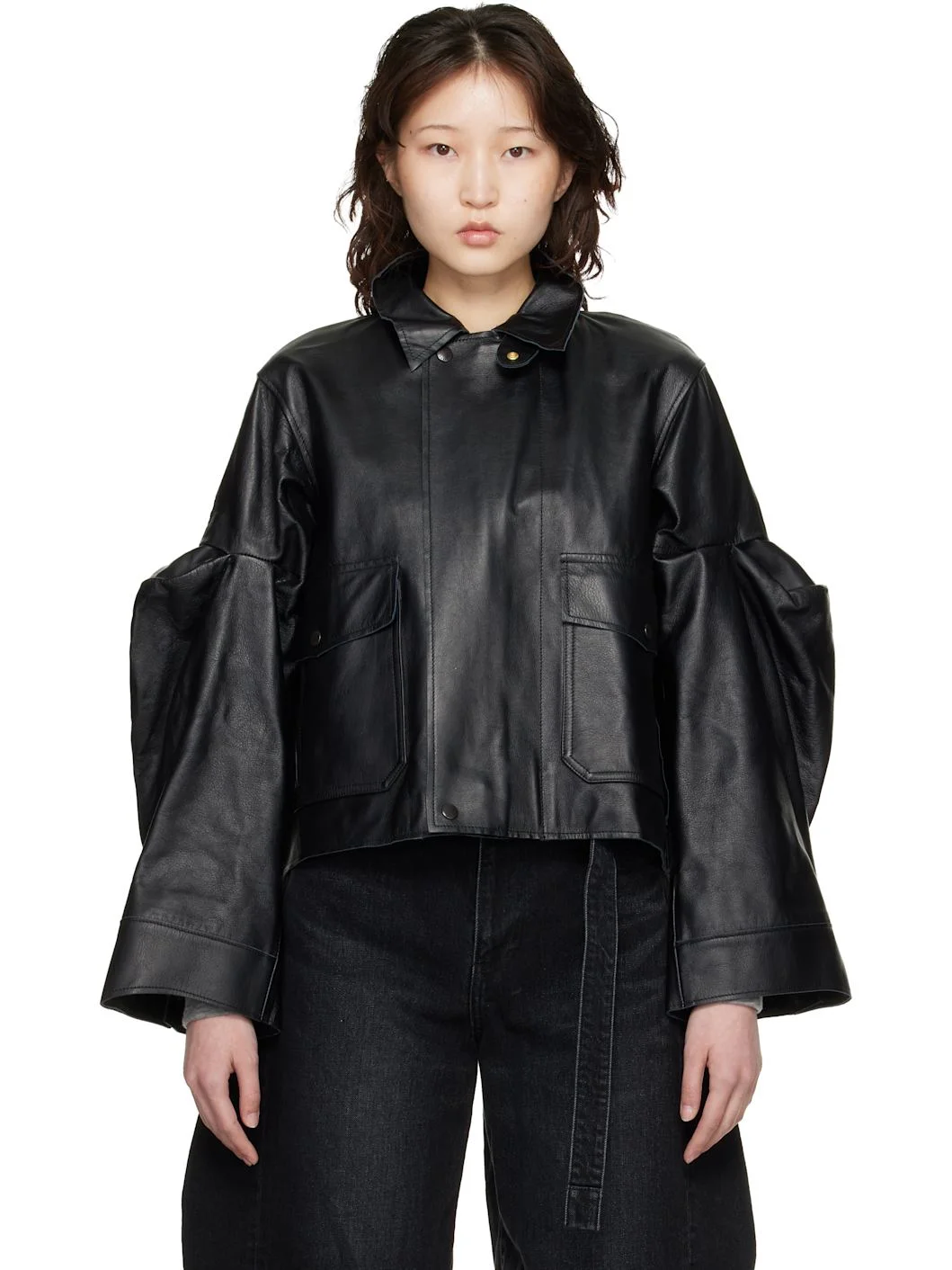 Grained leather jacket. · Press-stud tab at spread collar · Zip closure with press-stud placket · Flap and zip pockets at front · Partially elasticized hem · Pleats at modified balloon sleeves and back collar · Zip expansion panel at cuffs · Press-stud barrel cuffs · Full cupro twill lining Supplier color: Black Body: 100% leather. Lining: 100% cupro. Made in Japan 261445F064002