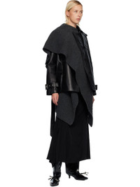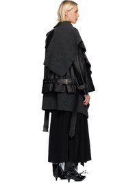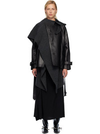 Grained leather jacket and insulated satin vest set. Vest features draped knit wool panels and two-way zip closure. Connecting press-studs at interior. · Hook-eye fastening and throat guard at spread collar · Double-breasted button closure · Flap pockets at waist · Detachable pin-buckle belt at hem · Epaulets · Raglan sleeves · Pin-buckle tab at cuffs · Storm flap and inverted box pleat at back · Full satin lining Supplier color: BlackxC/Gray Body 1: 100% leather. Body 2: 100% polyester. Body 3: 100% wool. Fill: 100% polyester. Lining 1: 56% rayon, 44% cupro. Lining 2: 100% polyester. Made in Japan 252445F064003