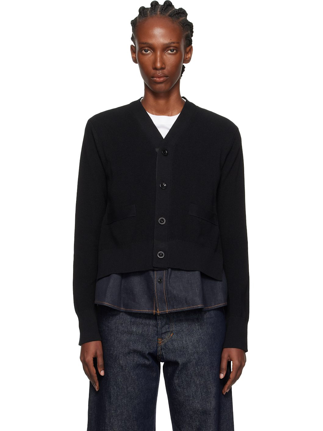 Rib-knit cotton-blend and non-stretch denim cardigan. · Layered construction · Y-neck · Button closure · Welt pockets at waist · Shirttail hem · Pleats at back hem · Partial mesh lining · Contrast stitching in tan Supplier color: Black/Indigo Body 1: 57% cotton, 43% polyester. Body 2: 100% cotton. Lining: 100% polyester. Made in Japan 252445F095000
