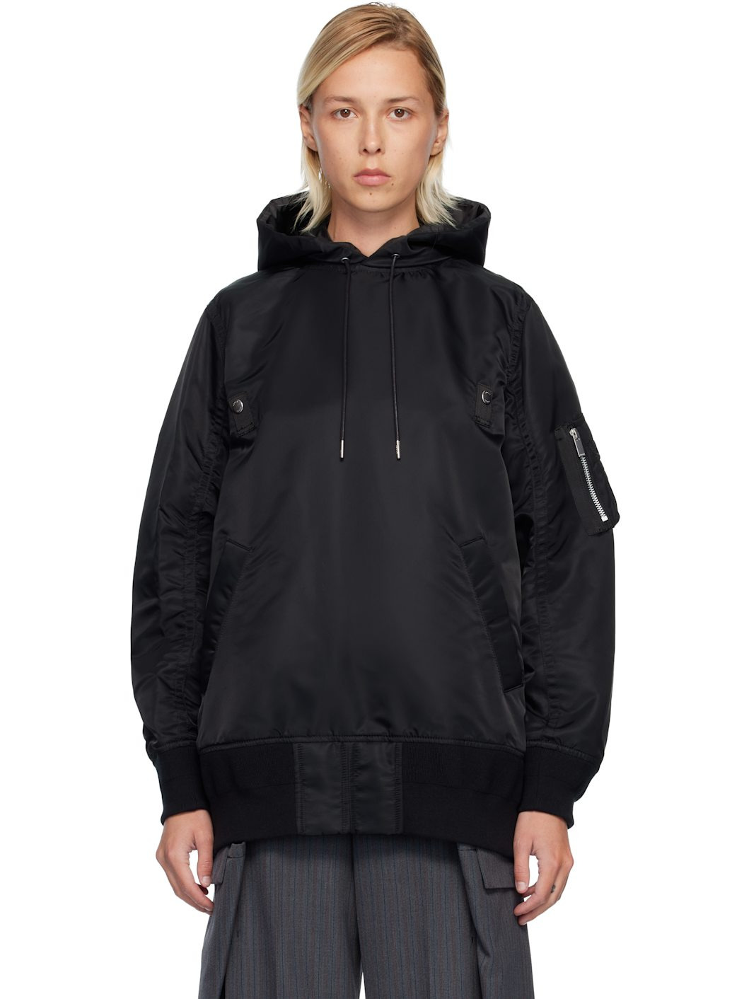 Nylon twill hoodie. · Drawstring at hood · Press-stud tabs at chest · Welt pockets at waist · Rib-knit hem and cuffs · Utility pocket and pen slots at sleeve · Zip vent at back · Full satin lining Supplier color: Black Body: 100% nylon. Trim: 55% polyester, 44% cotton, 1% polyurethane. Lining: 100% polyester. Made in Japan 252445F097012