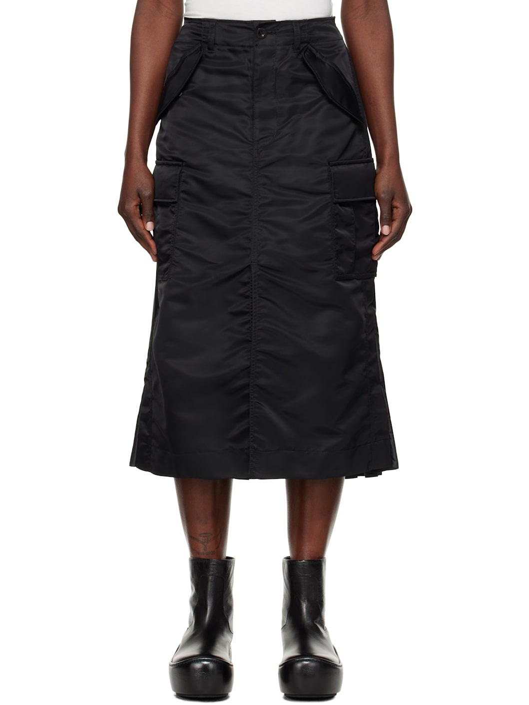 Nylon twill and polyester sateen midi skirt. · Partially elasticized waistband · Belt loops · Zip-fly · Flap pockets at front · Cargo pocket at side seams · Knife pleats at back · Partial cupro lining Supplier color: Black Body 1: 100% nylon. Body 2: 100% polyester. Lining: 100% cupro. Made in Japan 251445F092000