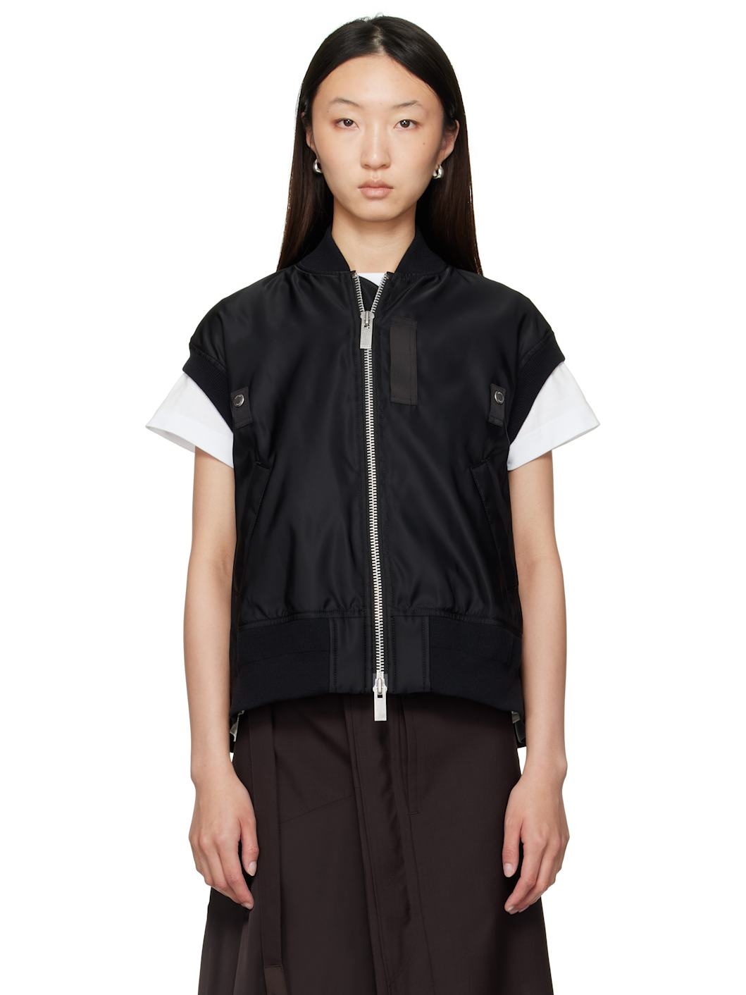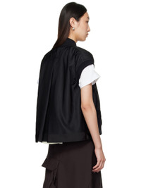 Padded nylon twill vest. · Rib-knit stand collar, hem, and armscyes · Two-way zip closure · Webbing trim and press-stud tabs at front · Welt pockets · Inverted box pleat at back yoke · Full satin lining Supplier color: Black Body: 100% nylon. Trim: 55% polyester, 44% cotton, 1% polyurethane. Fill: 100% polyester. Lining: 100% cupro. Made in Japan 252445F068000