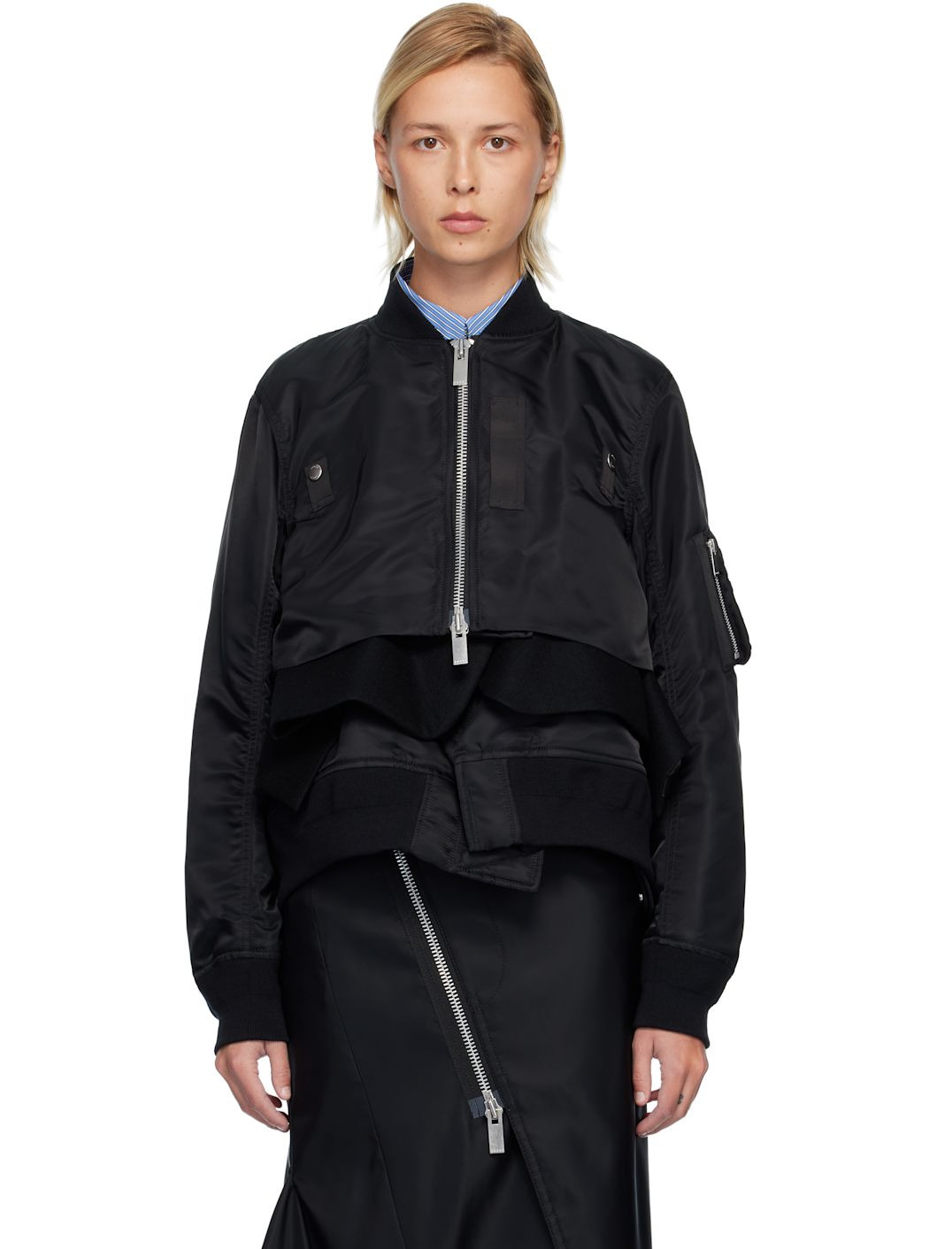 Nylon satin bomber jacket. · Paneled construction · Rib-knit stand collar, hem, and cuffs · Two-way zip closure · Press-stud tabs at chest · Melton panel at waist · Cropped asymmetric hem · Vented side seams · Utility pocket and pen slots at sleeve · Full satin lining Supplier color: Black Body: 100% nylon. Trim: 55% polyester, 44% cotton, 1% polyurethane. Fill: 100% polyester. Lining: 100% polyester. Made in Japan 252445F058008