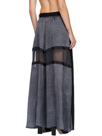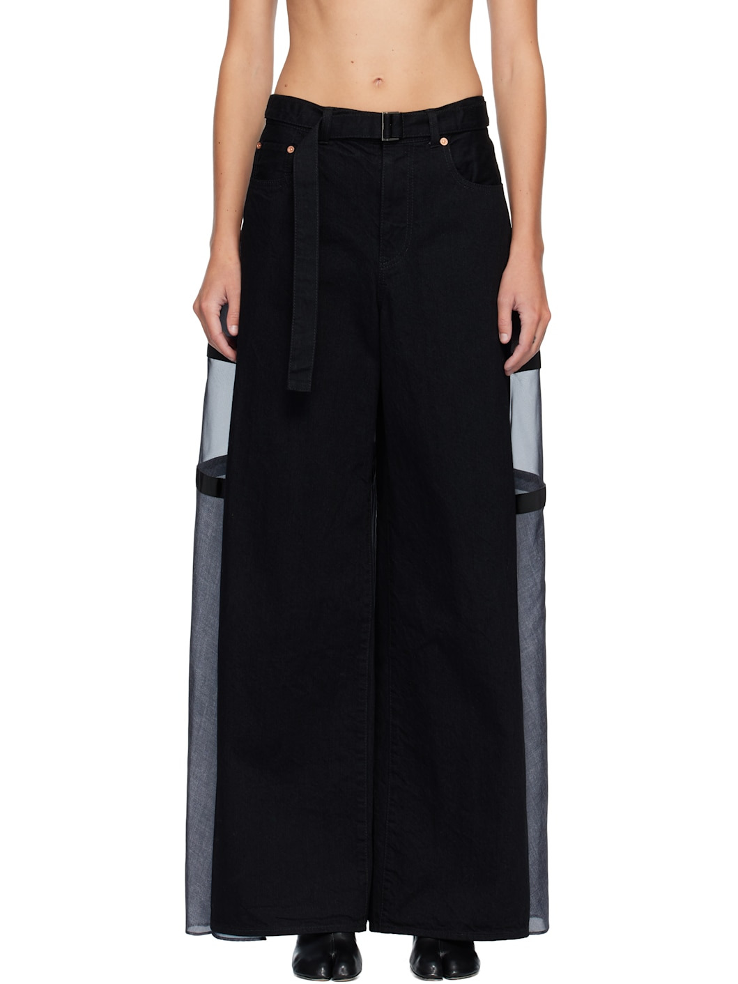 Non-stretch denim jeans. · Paneled construction · Belt loops and detachable cinch belt · Five-pocket styling · Zip fly · Grosgrain trim and semi-sheer satin panel at back Supplier color: Black Body 1: 100% cotton. Body 2: 100% polyester. Trim: 100% cupro. Made in Japan 252445F069003