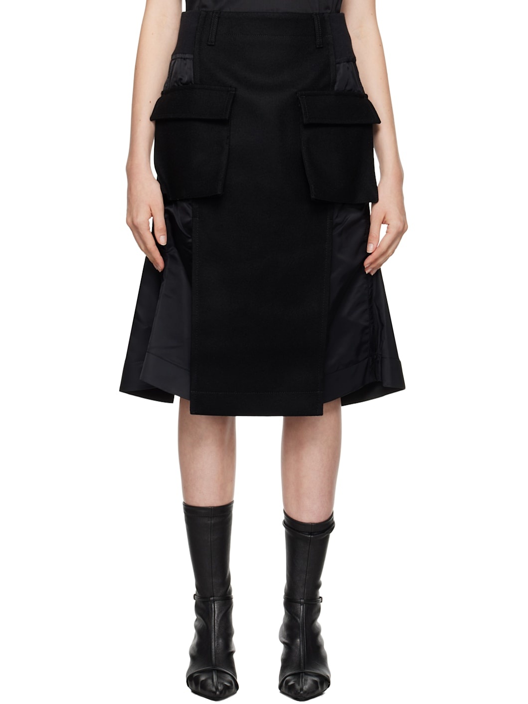 Wool melton and nylon satin midi skirt. · Paneled construction · Belt loops at partially rib knit waistband · Four-pocket styling · Vents at front and back hem · Zip closure at back waistband · Satin and taffeta lining Supplier color: Black Body 1: 100% wool. Body 2: 100% nylon. Trim: 55% polyester, 44% cotton, 1% polyurethane. Lining 1: 100% polyester. Lining 2: cupro. Made in Japan 242445F092012