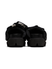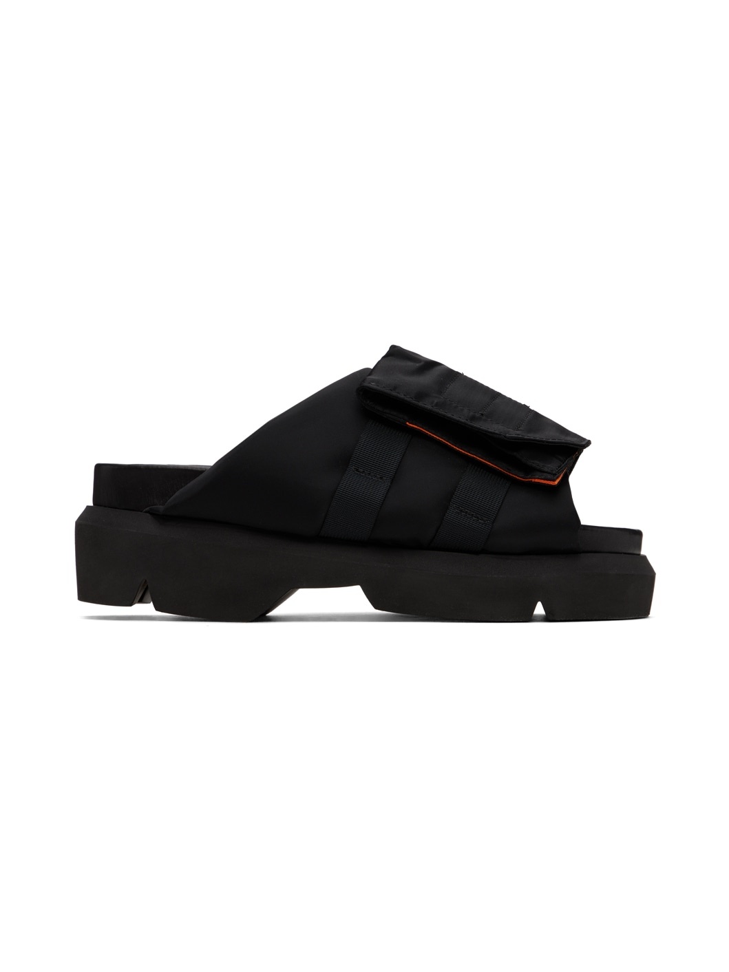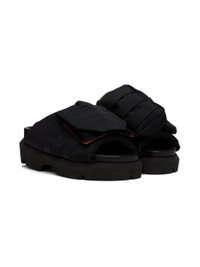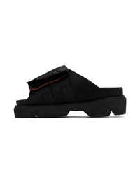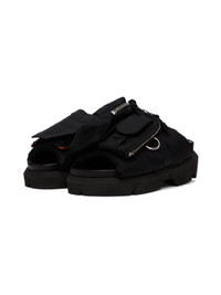Padded sateen slides in black. · Webbing trim throughout · Open toe · Flap pocket at vamp · Zip utility pocket and D-rings at vamp · Mesh lining · Molded calfskin footbed · Platform foam rubber midsole · Treaded Vibram® rubber sole · Platform: H1.5" Supplier color: Black Upper: textile. Sole: rubber. Made in Japan 241445F124002