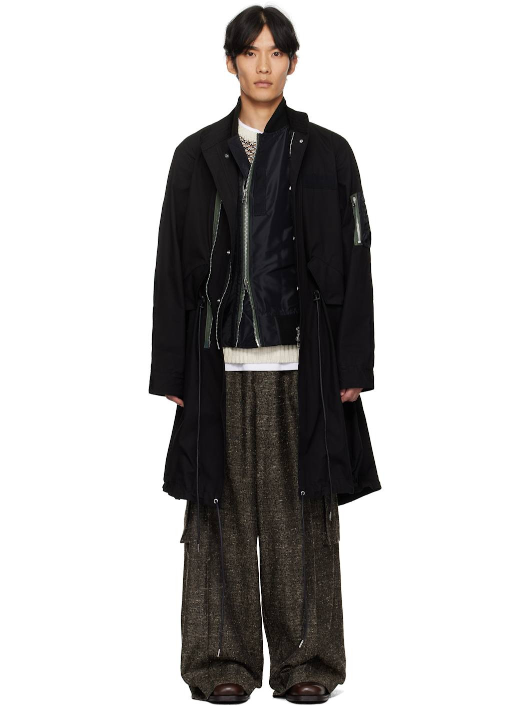 Padded cotton- and nylon-blend ripstop coat. · Paneled construction · Stand collar with rib-knit underlay · Two-way zip closure and press-stud placket · Webbing trim at chest · Flap pockets at waist · Drawstring at waist and hem · Rib-knit trim at hem · Utility pocket and pen slots at sleeve · Button tab at cuffs · Central vent at fishtail hem · Partial satin lining Supplier color: Black Body: 53% cotton, 47% nylon. Body 2: 100% nylon. Trim: 53% acrylic, 36% wool, 10% polyester, 1% polyurethane. Fill: 100% polyester. Lining: 100% polyester. Made in Japan 252445M176001