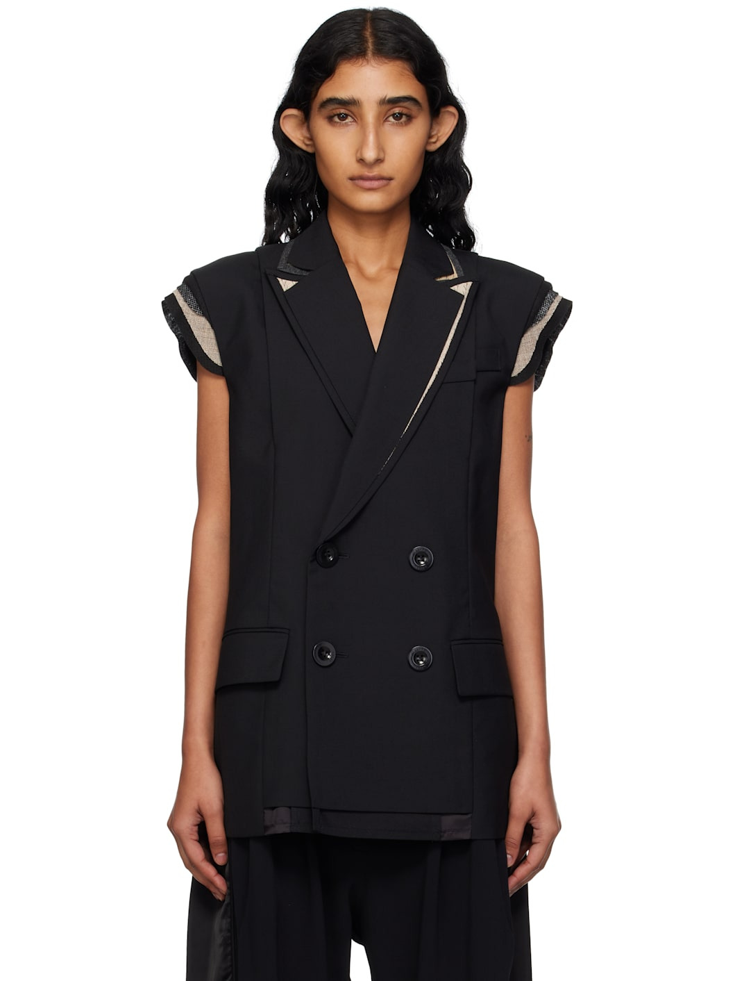 Plain-woven wool-blend blazer. · Layered construction · Mesh, hopsack, and felted trim with raw edge throughout · Peaked lapel · Mock welt pocket at chest · Double-breasted button closure · Flap pockets at waist · Cap sleeves · Central vent at back hem · Full cupro satin lining Supplier color: Black Body: 70% polyester, 30% wool. Lining: 100% cupro. Made in Japan 252445F057001