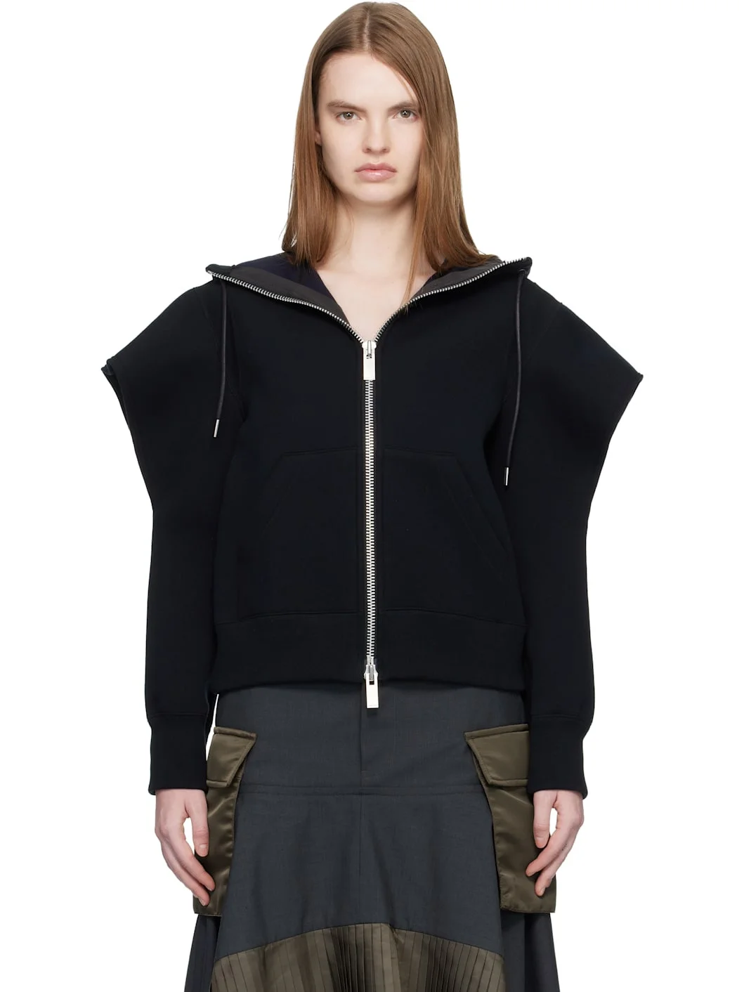 Cotton-blend double-faced jersey hoodie. · Drawstring at hood · Two-way zip closure · Patch pockets at front · Rib-knit hem and cuffs · Rib-knit trim at shoulders · Cutout at sleeves Supplier color: Black Body: 62% cotton, 38% polyester. Trim: 100% cotton. Made in Japan 261445F097001