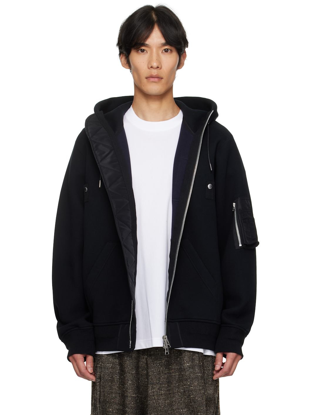 Padded cotton-blend hoodie. · Nylon satin trim throughout · Drawstring at hood · Two-way zip closure · Webbing trim and logo-engraved rivets at chest · Patch pockets at waist · Rib-knit hem and cuffs · Saddle shoulders · Utility pocket and pen slots at sleeve Supplier color: Black Body: 62% cotton, 38% polyester. Trim 1: 100% nylon. Trim 2: 55% polyester, 45% cotton. Fill: 100% polyester. Made in Japan 252445M202021