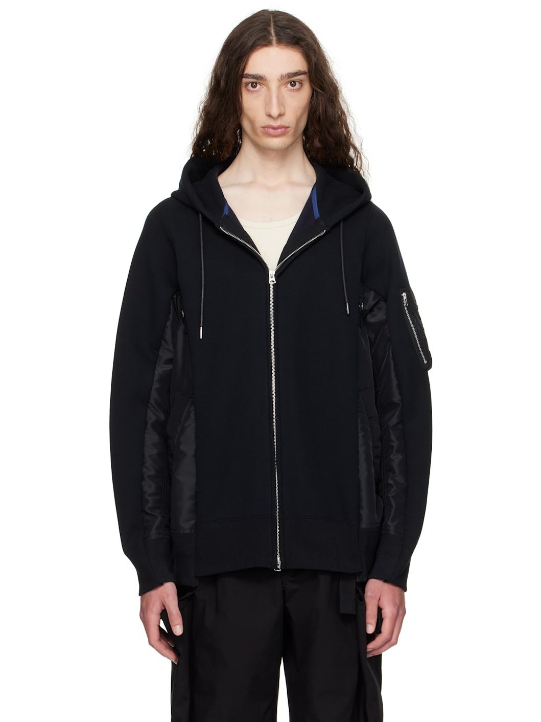 Cotton-blend jersey and nylon twill hoodie. · Paneled construction · Drawstring at hood · Two-way zip closure · Press-stud tabs at front · Welt pockets · Rib-knit hem and cuffs · Utility pocket at sleeve Supplier color: Black/Black Body 1: 62% cotton, 38% polyester. Body 2: 100% nylon. Trim 1: 55% polyester, 44% cotton, 1% polyurethane. Trim 2: 100% cotton. Fill: 100% polyester. Made in Japan 252445M202012