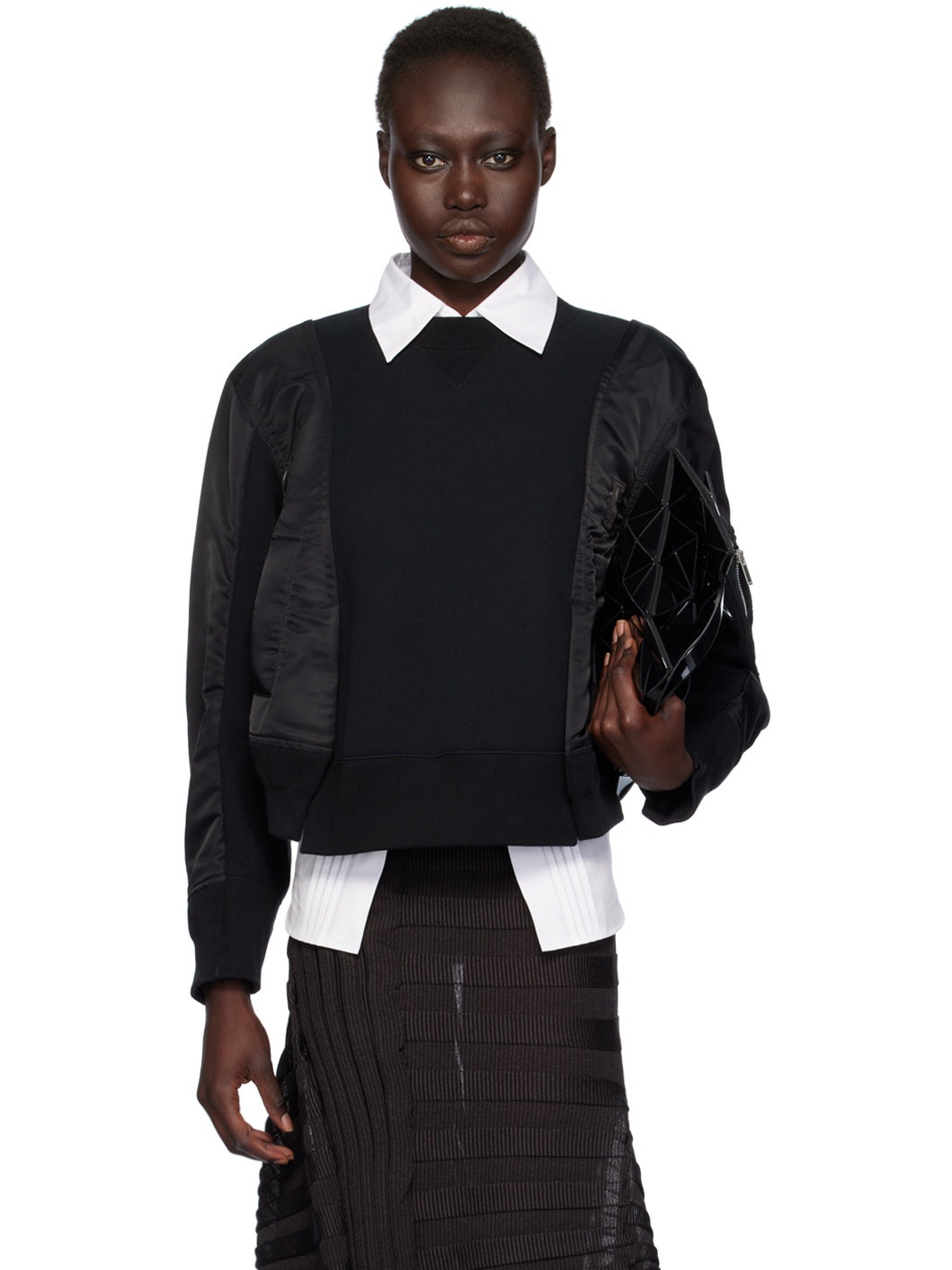 Double-faced cotton-blend jersey and nylon satin sweatshirt. · Paneled construction · Rib knit crewneck, hem, and cuffs · Press-stud grosgrain trim at chest · Welt pockets · Twin vents at front and back hem · Utility pocket at sleeve · Logo-engraved silver-tone hardware Supplier color: Black Body: 62% cotton, 38% polyester. Trim 1: 100% cotton. Trim 2: 100% nylon. Trim 3: 55% polyester, 44% cotton, 1% polyurethane. Lining: 100% polyester. Made in Japan 242445F096012