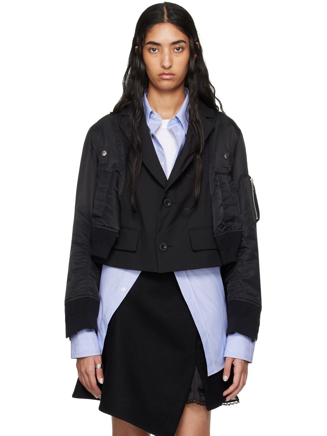 Polyester- and wool-blend broadcloth and nylon twill blazer. · Paneled construction · Notched lapel · Two-button closure · Flap and welt pockets · Twin vents at front hem · Partial rib knit hem and cuffs · Utility pocket at sleeve · Three-button surgeon's cuffs · Vents at back hem · Partial cupro satin lining Supplier color: Black Body 1: 70% polyester, 30% wool. Body 2: 100% nylon. Trim: 55% polyester, 44% cotton, 1% polyurethane. Lining: 100% cupro. Made in Japan 242445F058012