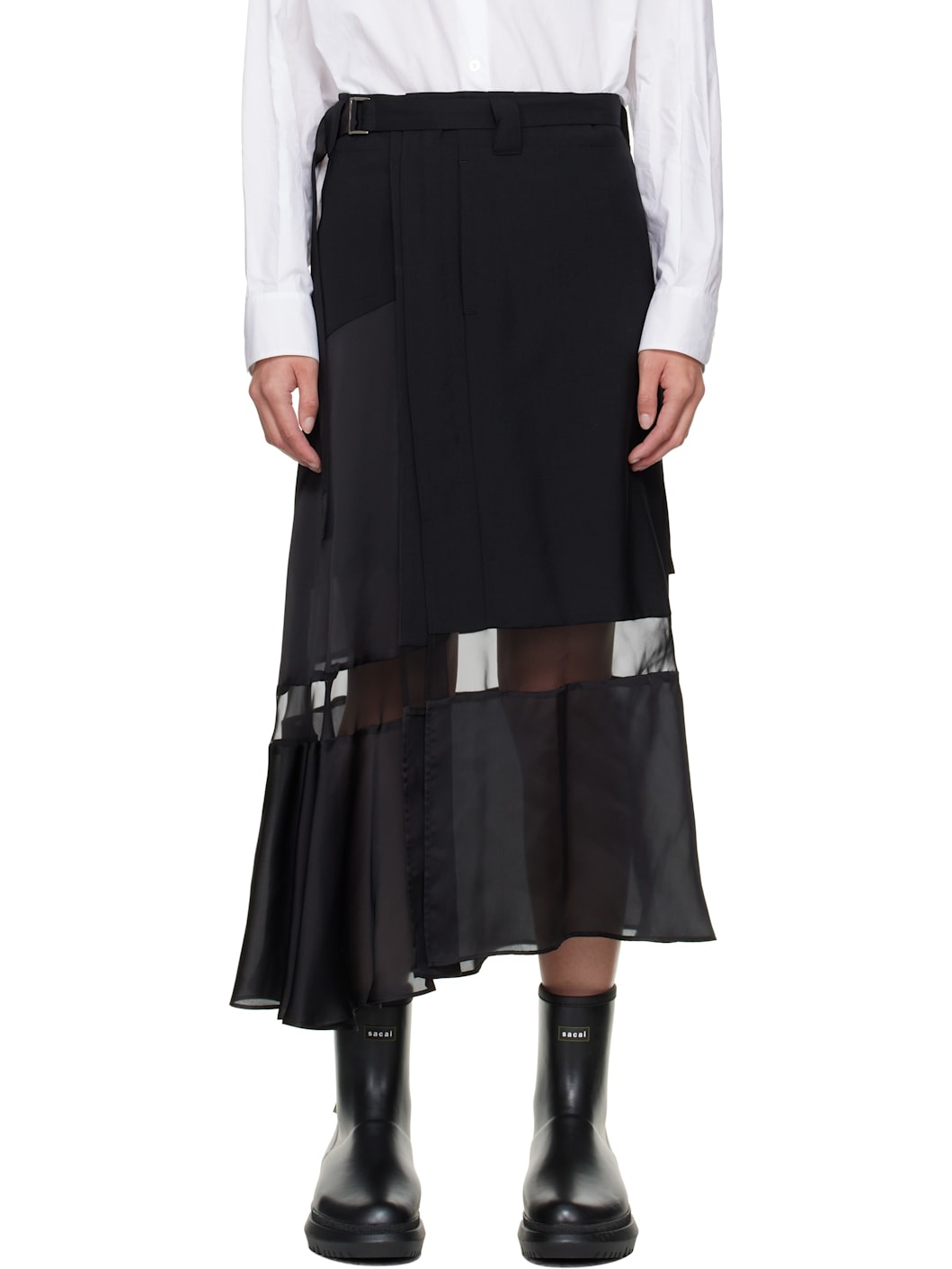 Plain-woven polyester, satin, and chiffon midi skirt. · Paneled construction · Belt loops and detachable cinch belt · Three-pocket styling · Zip closure and cargo pocket at side seam · Partial cupro satin lining Supplier color: Black Body 1: 100% polyester. Trim: 100% polyester. Lining: 100% cupro. Made in Japan 252445F092015