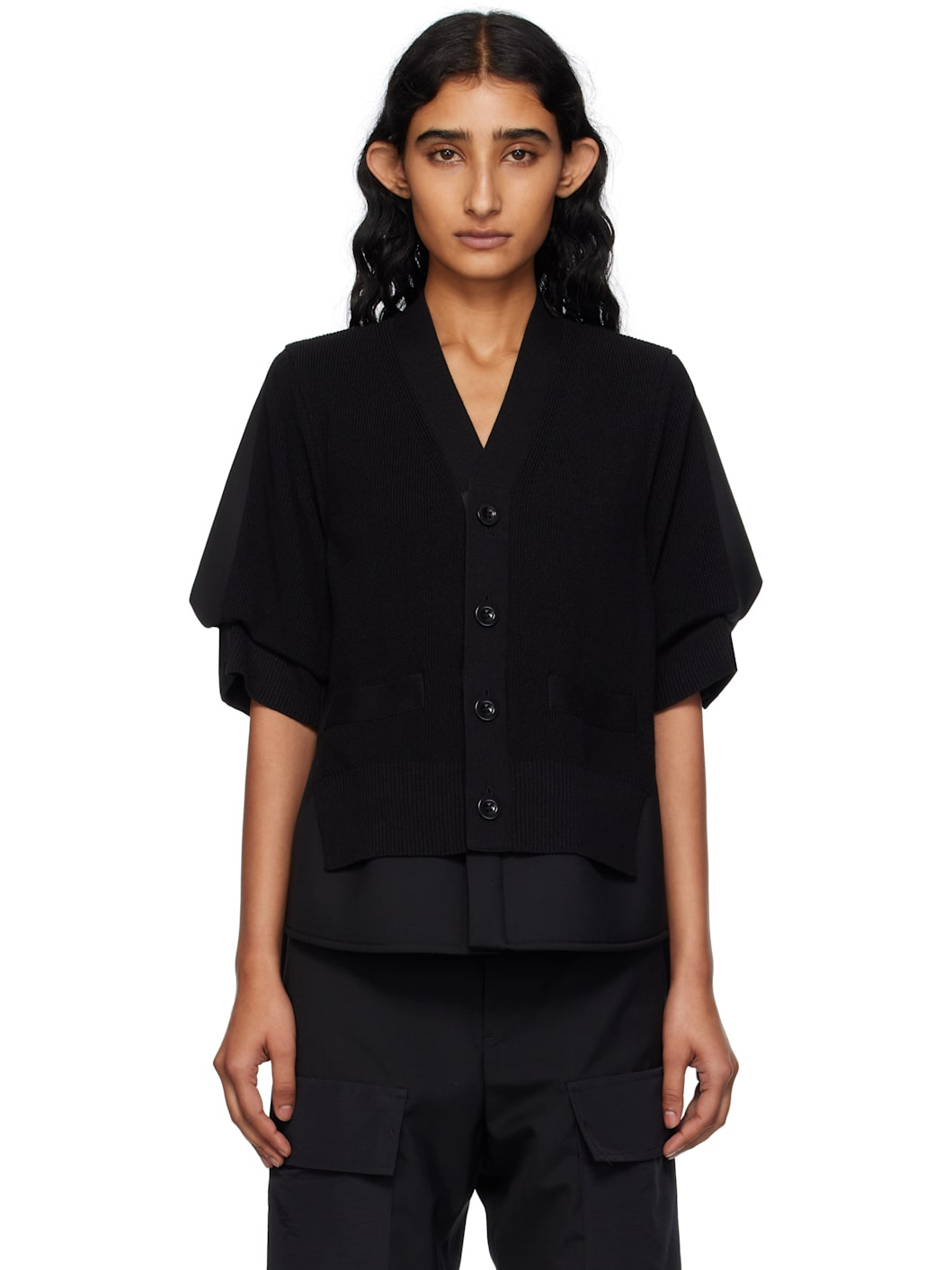Knit cotton-blend and wool-blend bonded jersey cardigan. · Paneled and layered construction · Y-neck · Button closure · Welt pockets at waist · Partial rib-knit trim hem and cuffs · Buttoned cuffs · Knife pleats and box pleats at back yoke · Partial mesh lining Supplier color: Black Body 1: 57% cotton, 43% polyester. Body 2: 70% polyester, 30% wool. Trim: 100% polyester. Lining: 100% polyester. Made in Japan 252445F095004