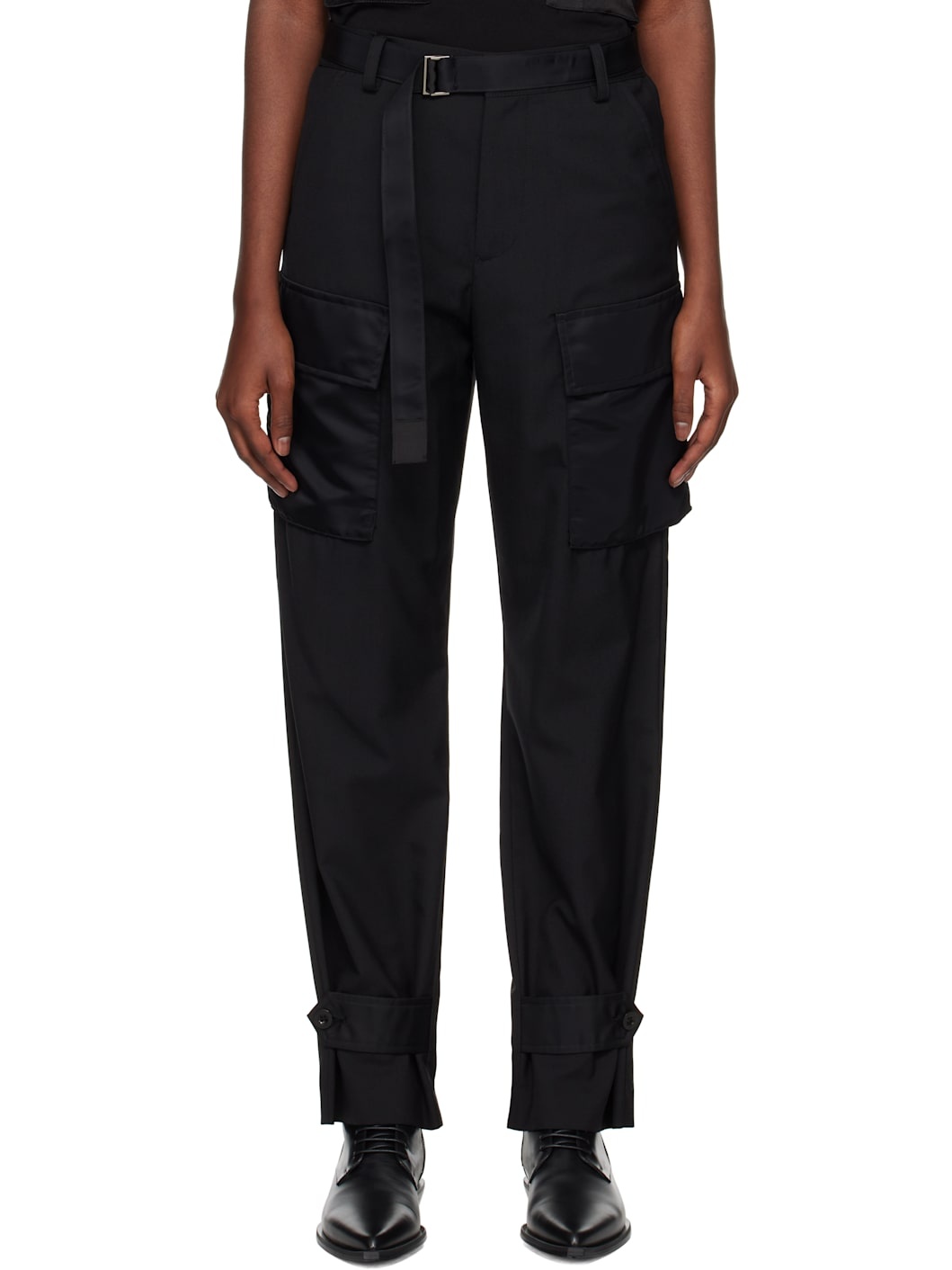 Polyester- and wool-blend delaine trousers. Nylon twill trim throughout. · Belt loops · Cinch belt at partially elasticized waistband · Four-pocket styling · Zip-fly · Button tab at cuffs · Flap pocket at outseams Supplier color: Black Body: 70% polyester, 30% wool. Trim: 100% nylon. Lining: 100% cupro. Made in Japan 242445F087005