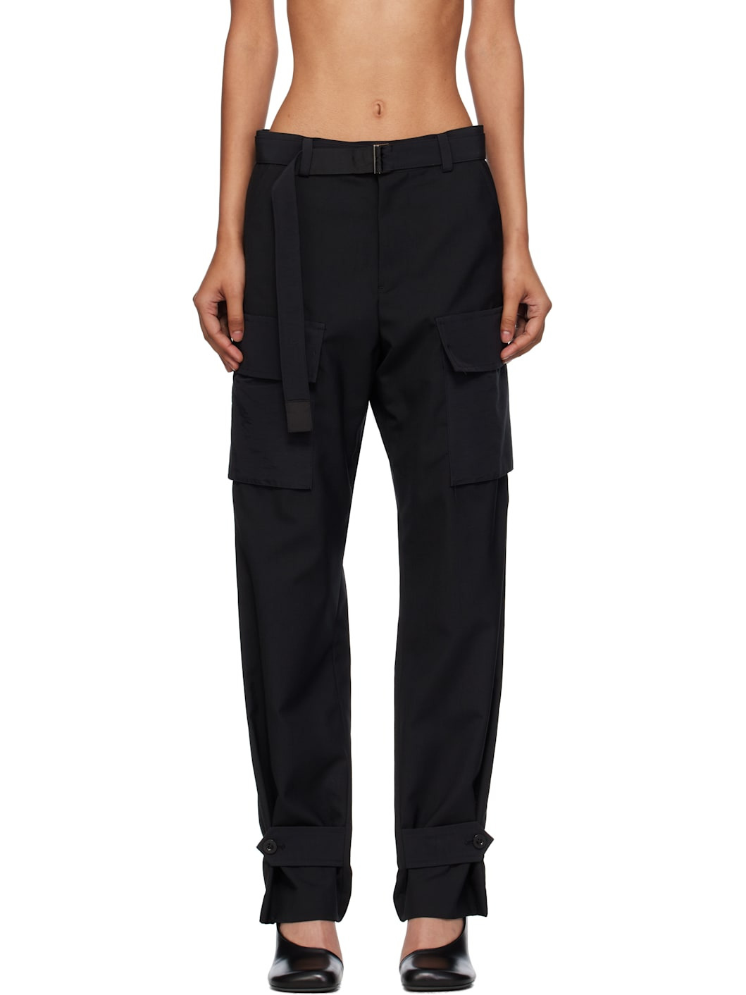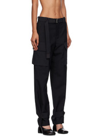 Plain-woven wool-blend trousers. · Belt loops · Detachable logo-engraved cinch belt · Four-pocket styling · Zip fly · Faille cargo pockets at outseams · Buttoned tab at legs · Partial cupro satin lining Supplier color: Black Body: 70% polyester, 30% wool. Trim: 60% cotton, 40% nylon. Pocket lining: 100% cupro. Made in Japan 252445F087003