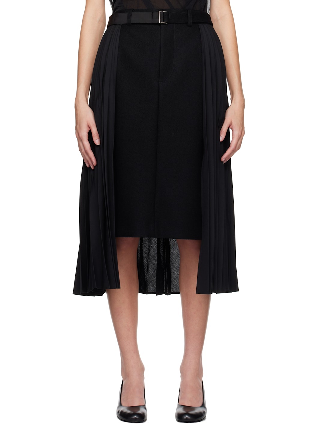 Wool melton and plain-woven polyester midi skirt. Pleats throughout. · Paneled construction · Cinch belt and belt loops at waistband · Zip-fly · Vents at front hem · Partial satin lining Supplier color: Black Body 1: 100% wool. Body 2: 100% polyester. Lining: 100% cupro. Made in Japan 242445F092023