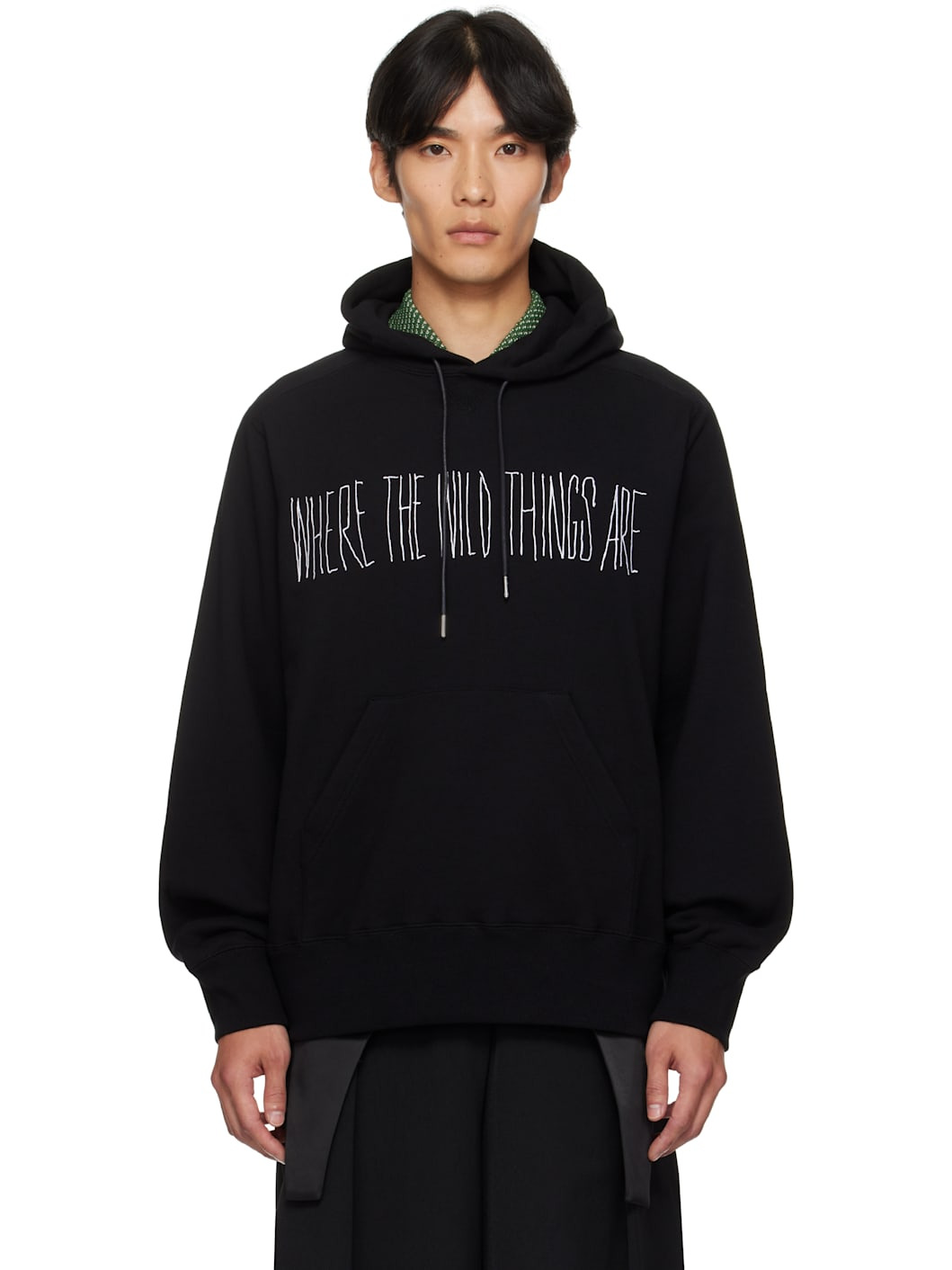 French terry hoodie. · Drawstring at hood · Text embroidered at front · Kangaroo pocket at waist · Rib-knit hem and cuffs · Saddle shoulders · Logo and graphic printed at back Part of the Where The Wild Things Are capsule. Supplier color: Black Body: 100% cotton. Trim: 100% rayon. Made in Japan 252445M202019