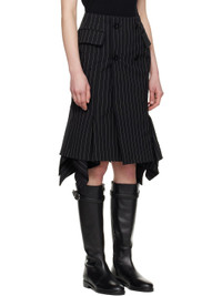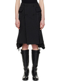 Plain-woven wool- and silk-blend midi skirt. Pinstripes throughout. · Wrap construction · Two-pocket styling · Double-breasted button closure · Inverted box pleats at front and back hem · Central vent at back hem · Full cupro satin lining Supplier color: Black stripe Body: 72% wool, 28% silk. Lining: 100% cupro. Made in Japan 251445F092011