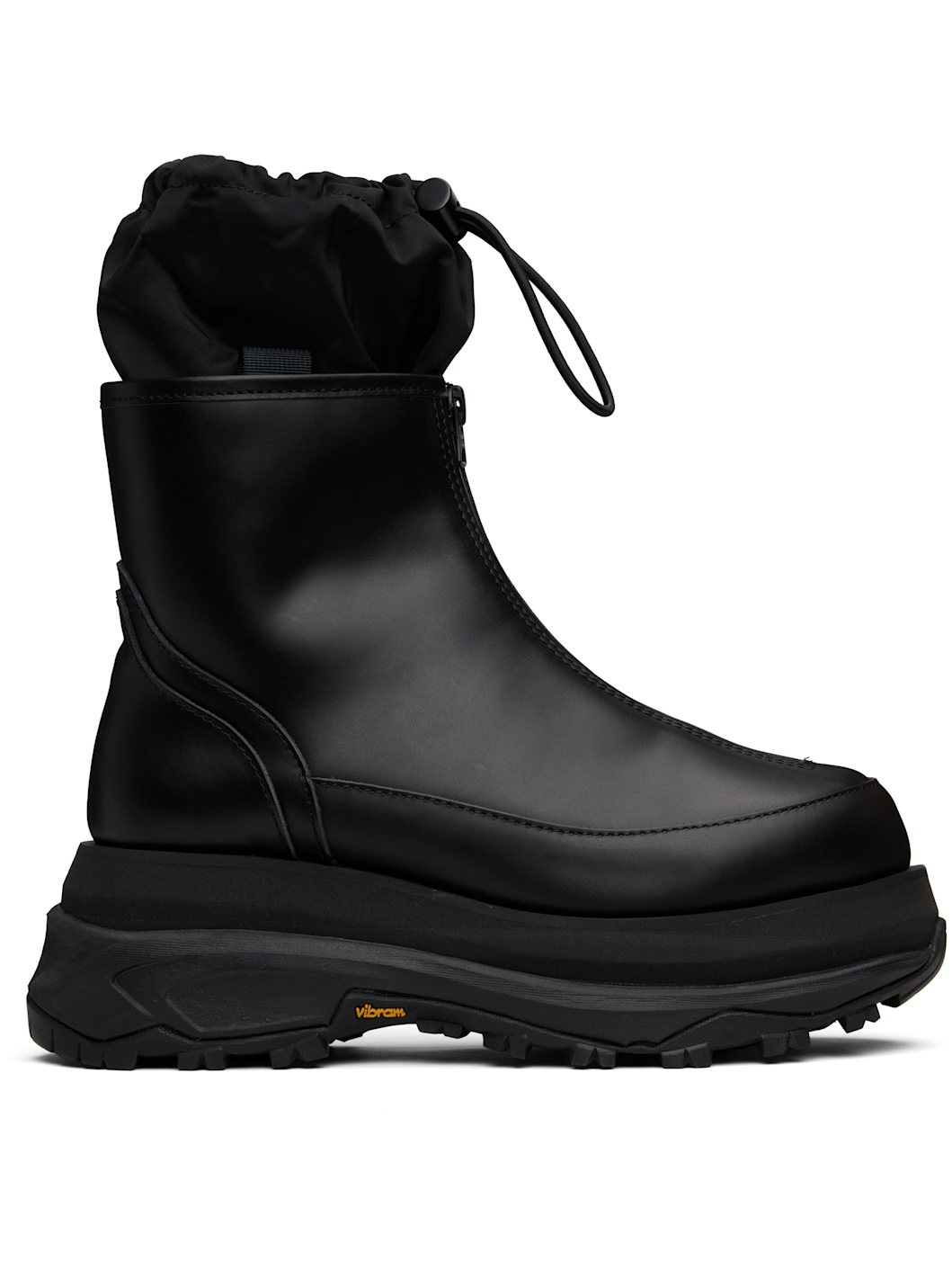 Ankle-high paneled buffed leather and twill boots. · Zip closure at vamp · Bungee-style drawstring at collar · Grosgrain pull-loops at heel collar · Foam rubber platform midsole · Treaded Vibram® rubber sole · Platform: H3" Supplier color: Black Upper: leather, textile. Sole: rubber. Made in Japan 252445F113001