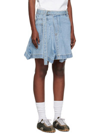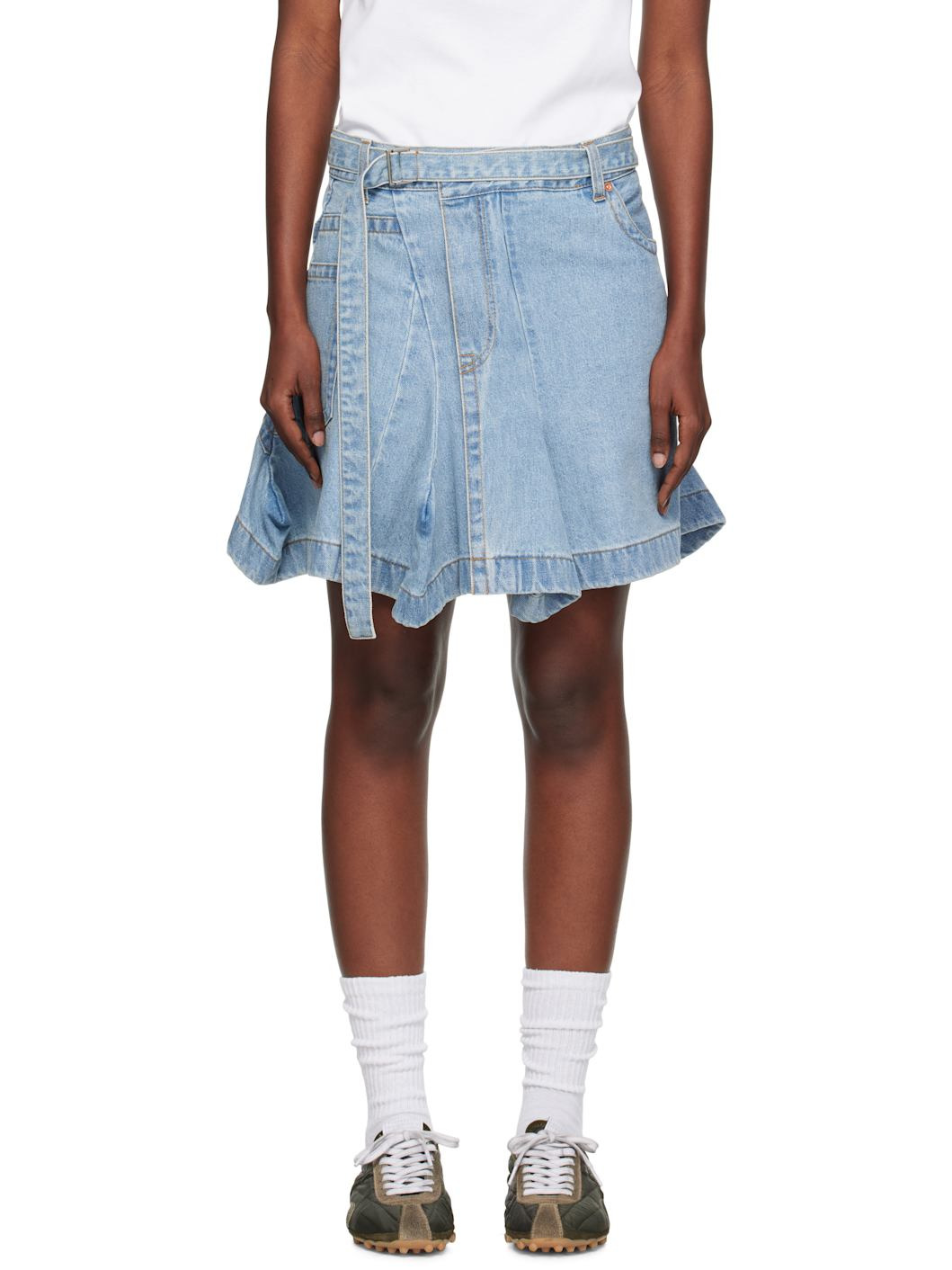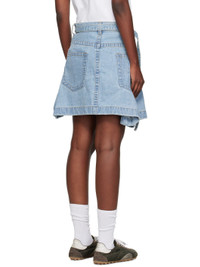 Non-stretch denim miniskirt. · Fading throughout · Cinch belt at belt loops · Three-pocket styling · Offset zip-fly · Asymmetrical hem · Contrast stitching in tan Supplier color: L/Blue 100% cotton. Made in Japan 252445F090003