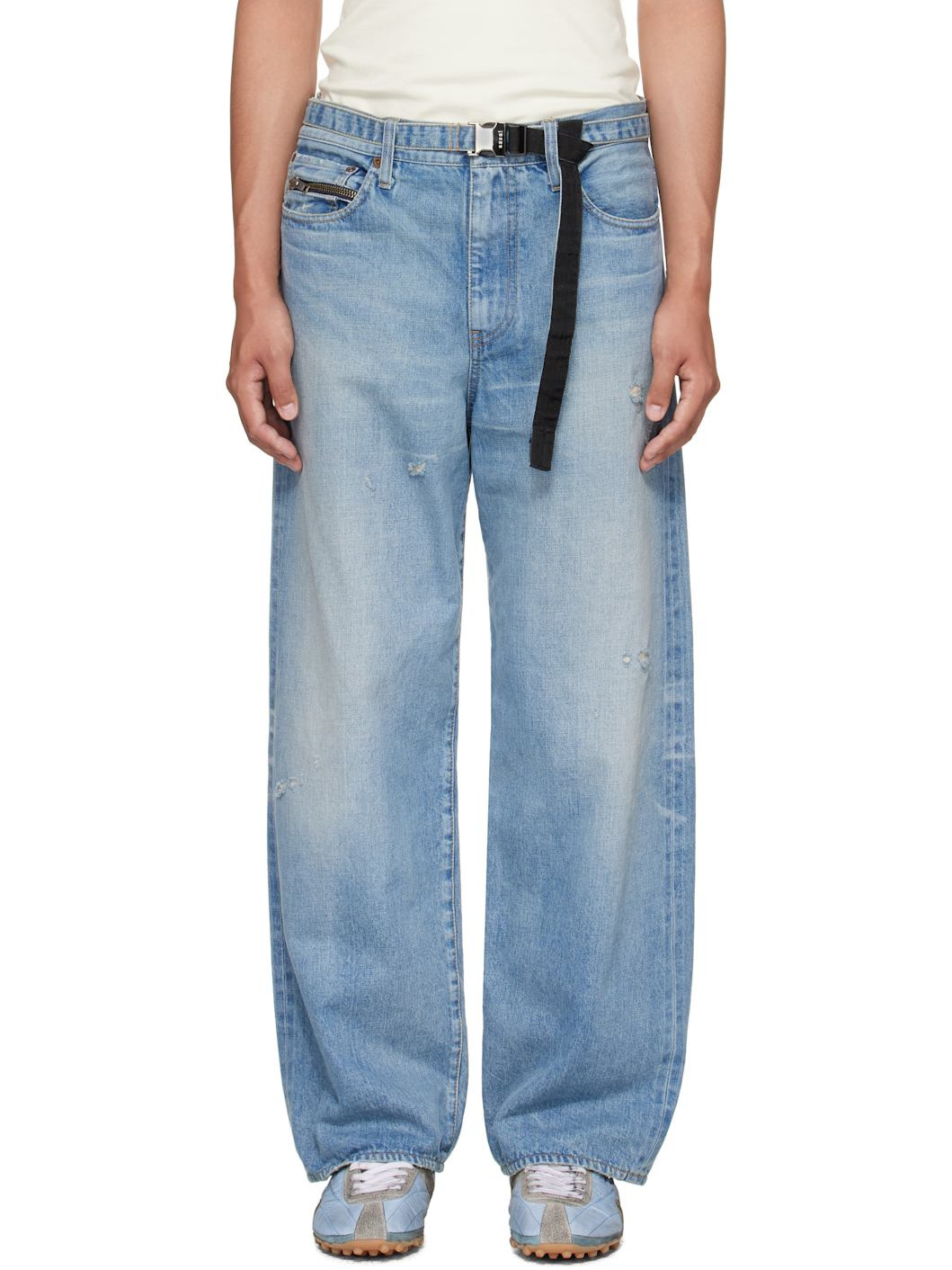 Non-stretch denim jeans. · Fading, whiskering, and distressing throughout · Belt loops · Detachable logo-engraved press-release belt · Five-pocket styling · Zip fly · Logo-engraved hardware · Contrast stitching in tan Supplier color: L/Blue 100% cotton. Made in Japan 252445M186003