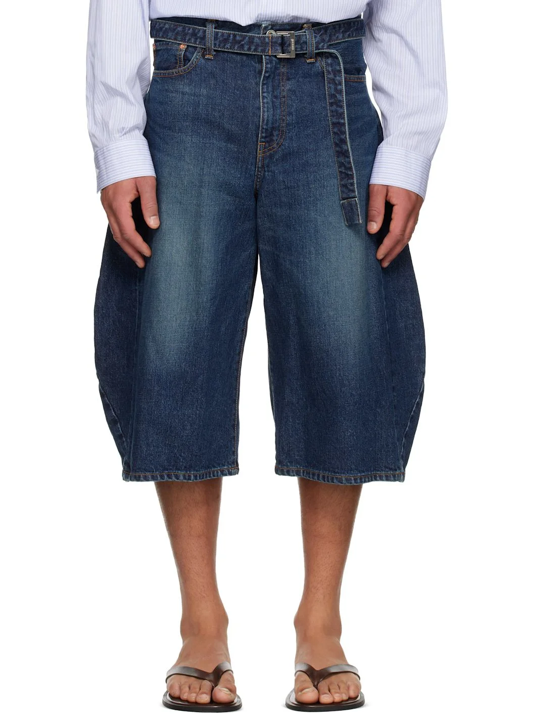 Non-stretch denim shorts. · Fading and whiskering throughout · Belt loops and detachable cinch belt at waistband · Five-pocket styling · Zip fly · Curved outseams · Patch pocket at outseam · Contrast stitching in white and tan Supplier color: Blue 100% cotton. Made in Japan 261445M193006