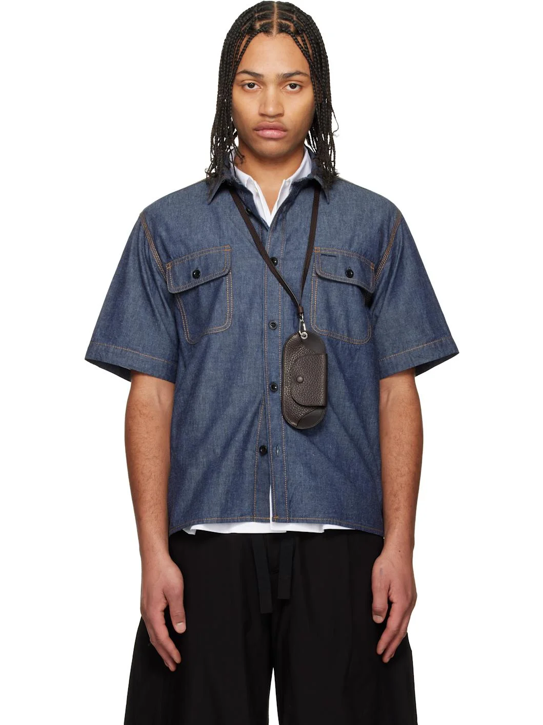 Lightweight non-stretch denim shirt. · Fading throughout · Spread collar · Button closure · Flap pockets at chest · Curved side seams · Droptail hem · Logo-engraved hardware · Contrast stitching in tan Supplier color: Blue 100% cotton. Made in Japan 261445M192016