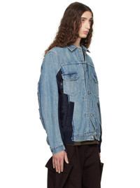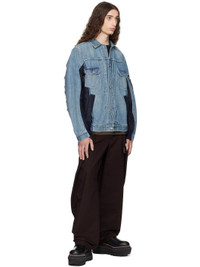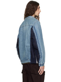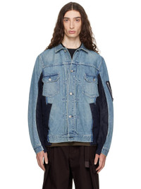 Nylon twill and non-stretch denim jacket. · Fading and raw edges throughout · Paneled construction · Spread collar · Button closure · Tucks and press-stud tabs at front · Flap and welt pockets · Rib-knit trim and zip vent at side seams · Utility pocket at sleeve · Rib-knit trim at cuffs Supplier color: L/blue Body 1: 100% cotton. Body 2: 100% nylon. Trim: 55% polyester, 44% cotton, 1% polyurethane. Fill: 100% polyester. Made in Japan 252445M177005