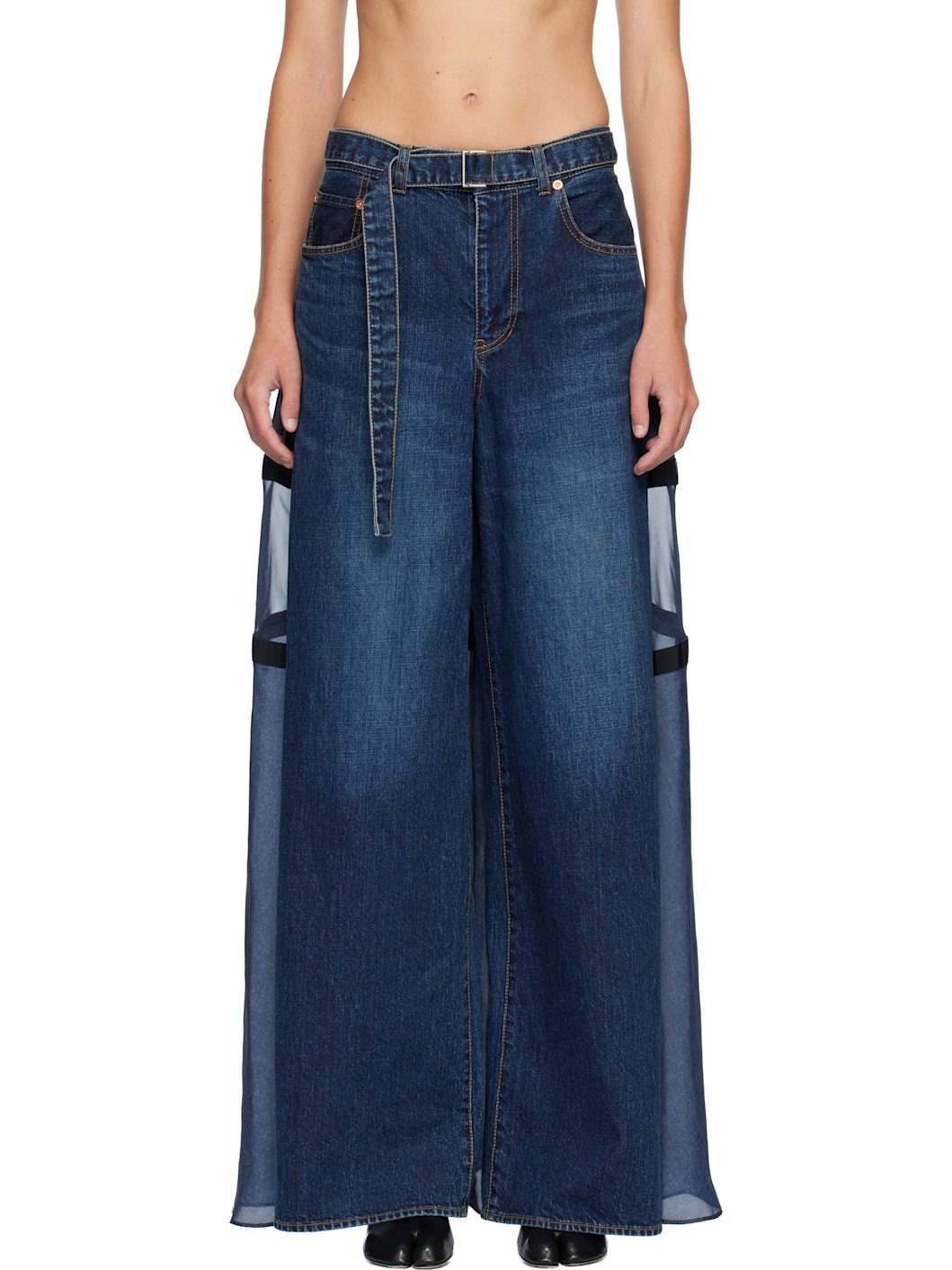 Non-stretch denim jeans. · Paneled construction · Fading and whiskering throughout · Belt loops and detachable cinch belt · Five-pocket styling · Zip fly · Grosgrain trim and semi-sheer satin panel at back · Contrast stitching in tan Supplier color: Blue Body 1: 100% cotton. Body 2: 100% polyester. Trim: 100% cupro. Made in Japan 252445F069002