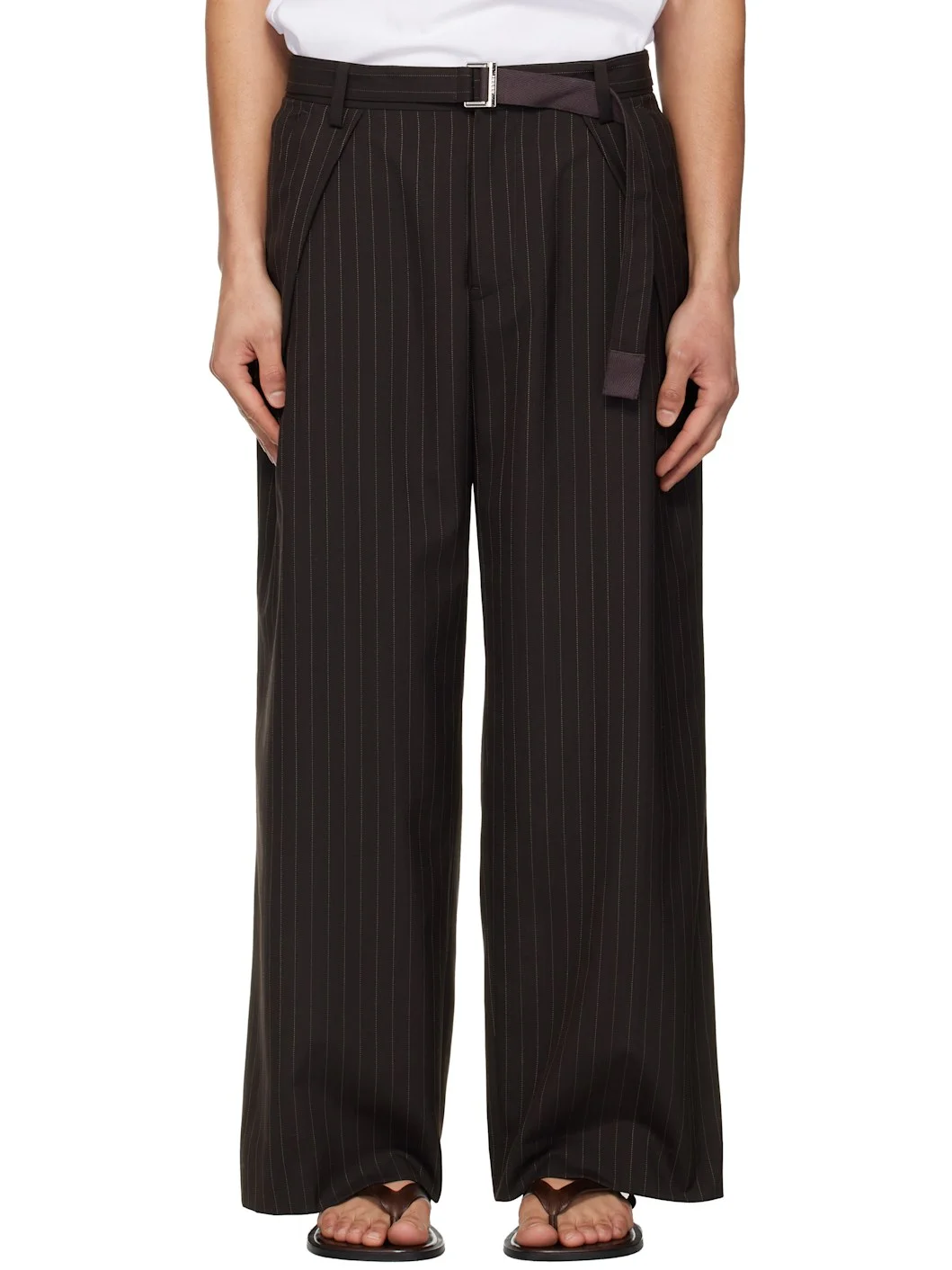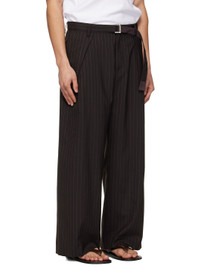 Plain-woven wool-blend trousers. · Stripes throughout · Belt loops and detachable cinch belt at waistband · Four-pocket styling · Zip fly · Pleats at front · Creased legs · Knee-length satin lining Supplier color: Brown Body: 70% polyester, 30% wool. Lining: 100% cupro. Made in Japan 261445M191005