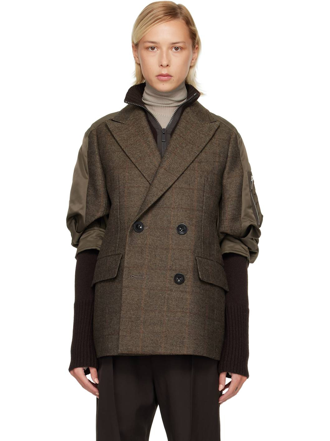 Brushed wool tweed blazer. · Check pattern throughout · Peaked lapel · Double-breasted button closure · Welt pocket at chest · Flap pockets at waist · Nylon satin puff sleeves · Utility pocket at sleeve · Adjustable press-stud barrel cuffs · Central vent at back hem · Full satin lining Supplier color: Beige x D/Khaki Body: 100% wool. Trim: 100% nylon. Lining: 100% cupro. Made in Japan 252445F063016