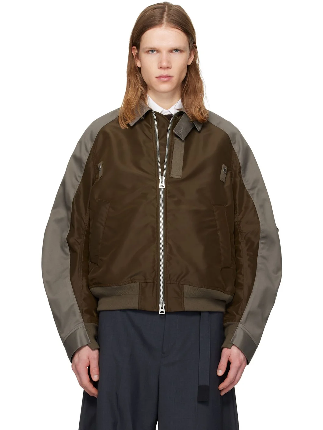 Brown & Gray Cotton Chino & Nylon Twill Bomber Jacket