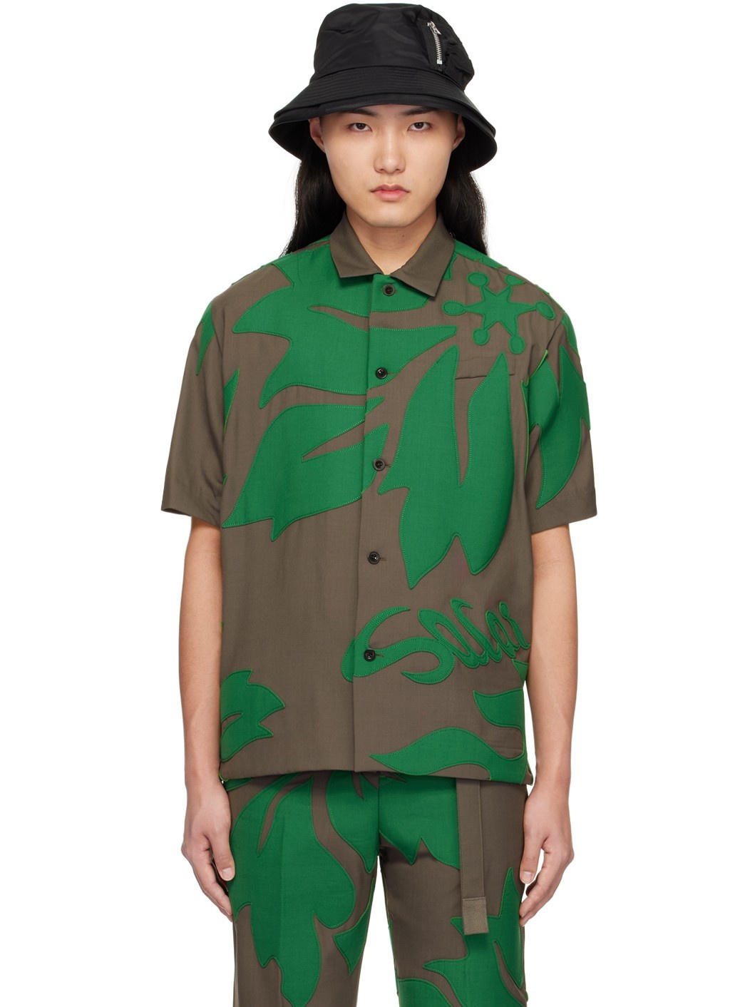 Plain-woven polyester- and wool-blend shirt. Floral appliques throughout. · Spread collar · Button closure · Mock patch pocket at chest · Logo applique at front · Droptail hem · Vented side seams Supplier color: Taupe/Green Body: 70% polyester, 30% wool. Trim: 90% wool, 10% nylon. Trim 2: 70% polyester, 30% wool. Trim 3: 80% polyester, 15% rayon, 5% polyurethane. Made in Japan 241445M192021
