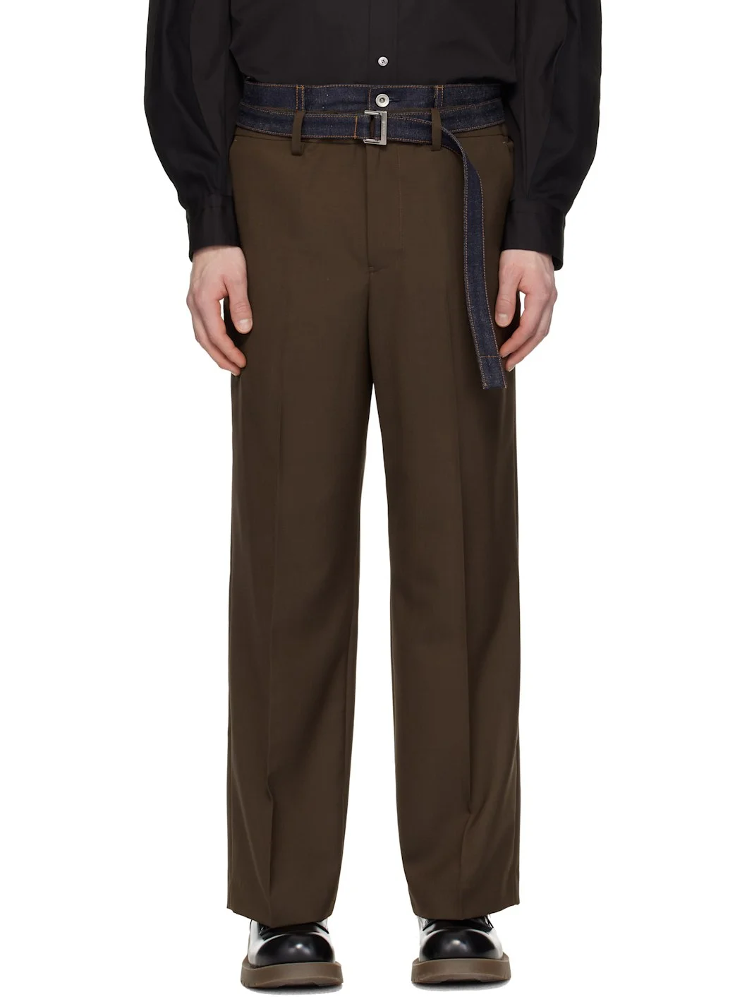 Plain-woven wool-blend trousers. · Layered denim waistband · Belt loops · Detachable denim cinch belt · Four pocket styling · Zip fly · Creased legs · Full satin lining Supplier color: Brown/Indigo Body: 70% polyester, 30% wool. Trim: 100% cotton. Lining: 100% cupro. Made in Japan 261445M191018