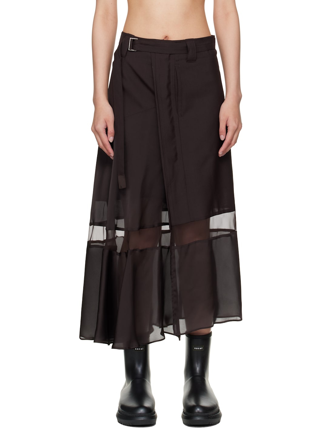 Plain-woven polyester, satin, and chiffon midi skirt. · Paneled construction · Belt loops and detachable cinch belt · Three-pocket styling · Zip closure and cargo pocket at side seam · Partial cupro satin lining Supplier color: Brown Body 1: 100% polyester. Trim: 100% polyester. Lining: 100% cupro. Made in Japan 252445F092007