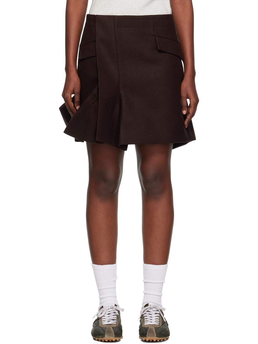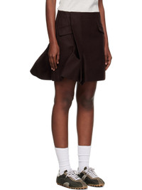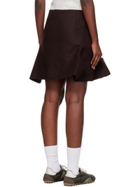 Wool melton miniskirt. · Darts and pleats throughout · Two-pocket styling · Offset zip closure · Asymmetrical flared hem · Full cupro satin lining Supplier color: Brown Body: 100% wool. Lining: 100% cupro. Made in Japan 252445F090000