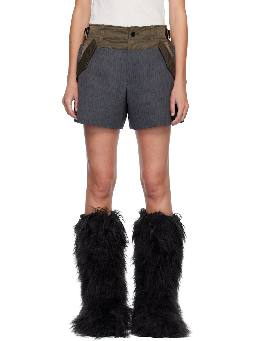 Wool-blend doeskin and nylon twill shorts. · Paneled construction · Striped throughout · Cinch tabs at partially elasticized waistband · Belt loops · Four-pocket styling · Zip fly · Full satin lining Supplier color: Gray/Khaki Body: 55% polyester, 45% wool. Trim: 100% nylon. Lining: 100% cupro. Made in Japan 252445F088001