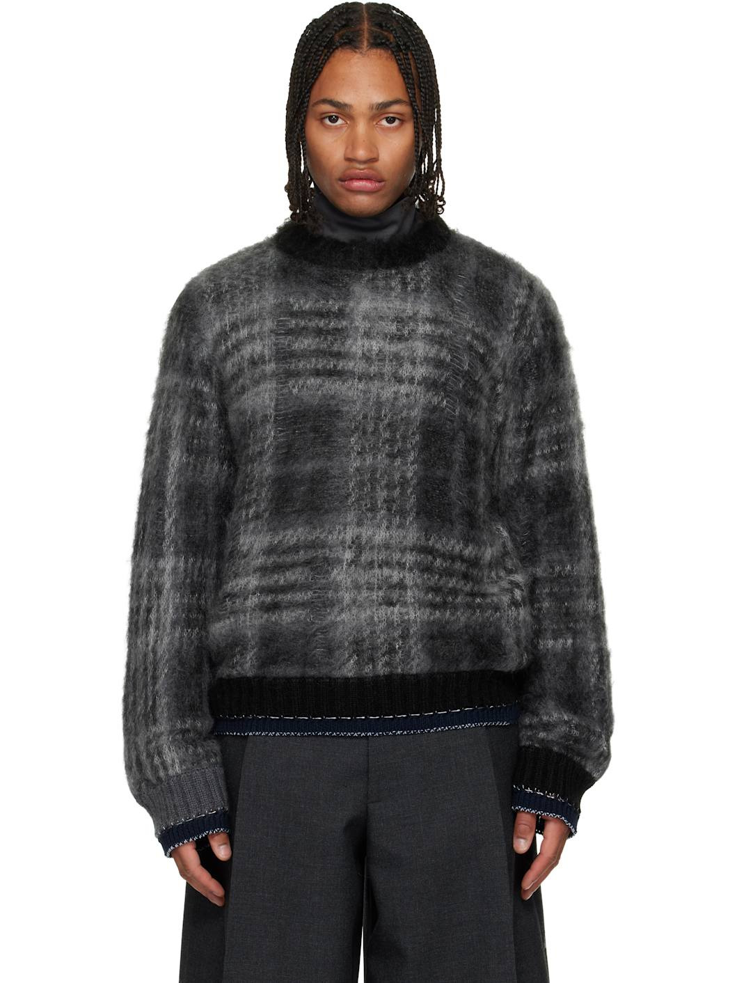 Brushed knit mohair-blend sweater. · Check pattern and distressing throughout · Rib-knit crewneck, hem, and cuffs · Blanket stitching at hem and cuffs Supplier color: Black Body: 55% mohair, 30% nylon, 15% wool. Trim: 80% cotton, 20% polyester. Made in Japan 252445M201009