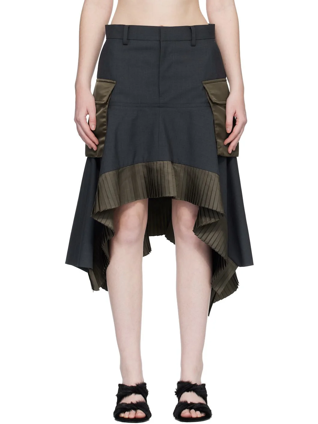 Plain-woven wool-blend midi skirt. · Belt loops · Four-pocket styling · Zip fly · Pleated satin trim at handkerchief hem · Satin cargo pocket at outseams · Full satin lining Supplier color: Gray/D khaki Body: 65% polyester, 35% wool. Trim 1: 100% polyester. Trim 2: 100% nylon. Lining: 100% cupro. Made in Japan 261445F092007