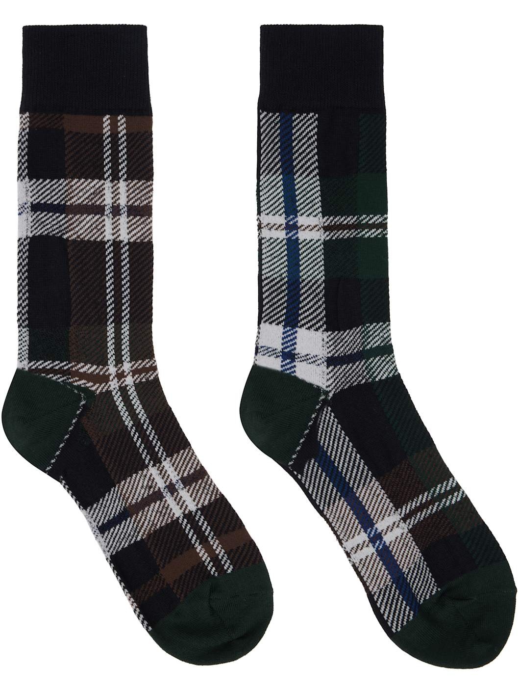 Pair of calf-high rib-knit stretch cotton-blend socks in green and brown. - Jacquard check pattern throughout - Logo printed at sole Supplier color: Green/Brown