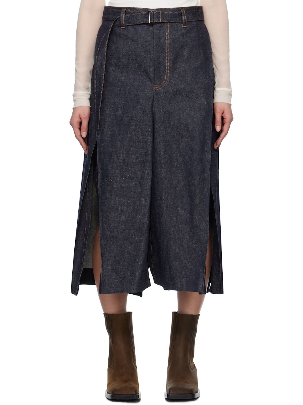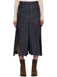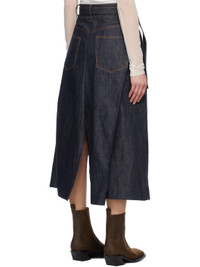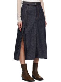 Non-stretch denim midi skirt. Pleats throughout. · Belt loops and detachable cinch belt · Four-pocket styling · Zip fly · Slits at hem · Partial twill lining · Contrast stitching in tan Supplier color: Indigo Body: 100% cotton. Lining: 100% cotton. Made in Japan 251445F092007