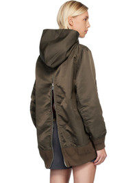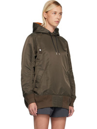 Nylon twill hoodie. · Drawstring at hood · Press-stud tabs at chest · Welt pockets at waist · Rib-knit hem and cuffs · Utility pocket and pen slots at sleeve · Zip vent at back · Full satin lining Supplier color: D/Khaki Body: 100% nylon. Trim: 55% polyester, 44% cotton, 1% polyurethane. Lining: 100% polyester. Made in Japan 252445F097011